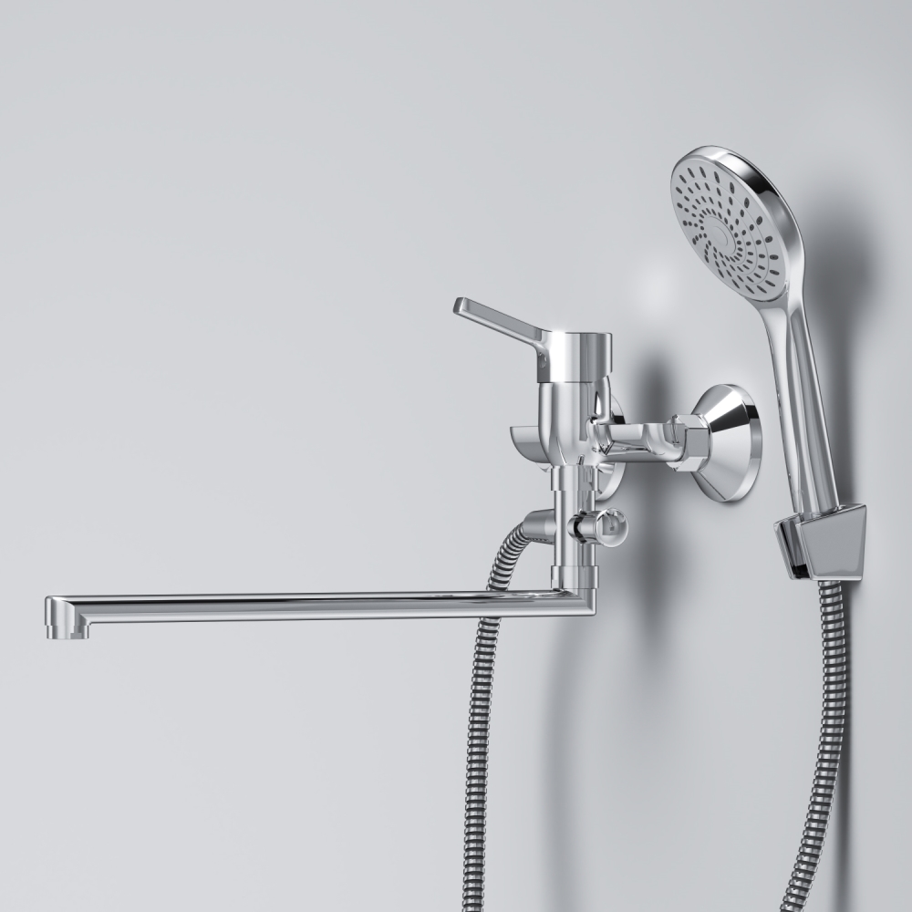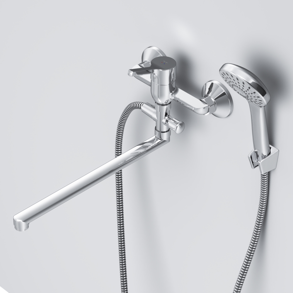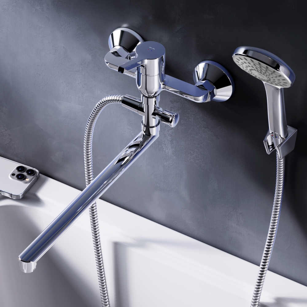 Стильное универсальное решение для ванной комнаты - качественный смеситель для ванны и душа с длинным поворотным изливом с душевым набором.
