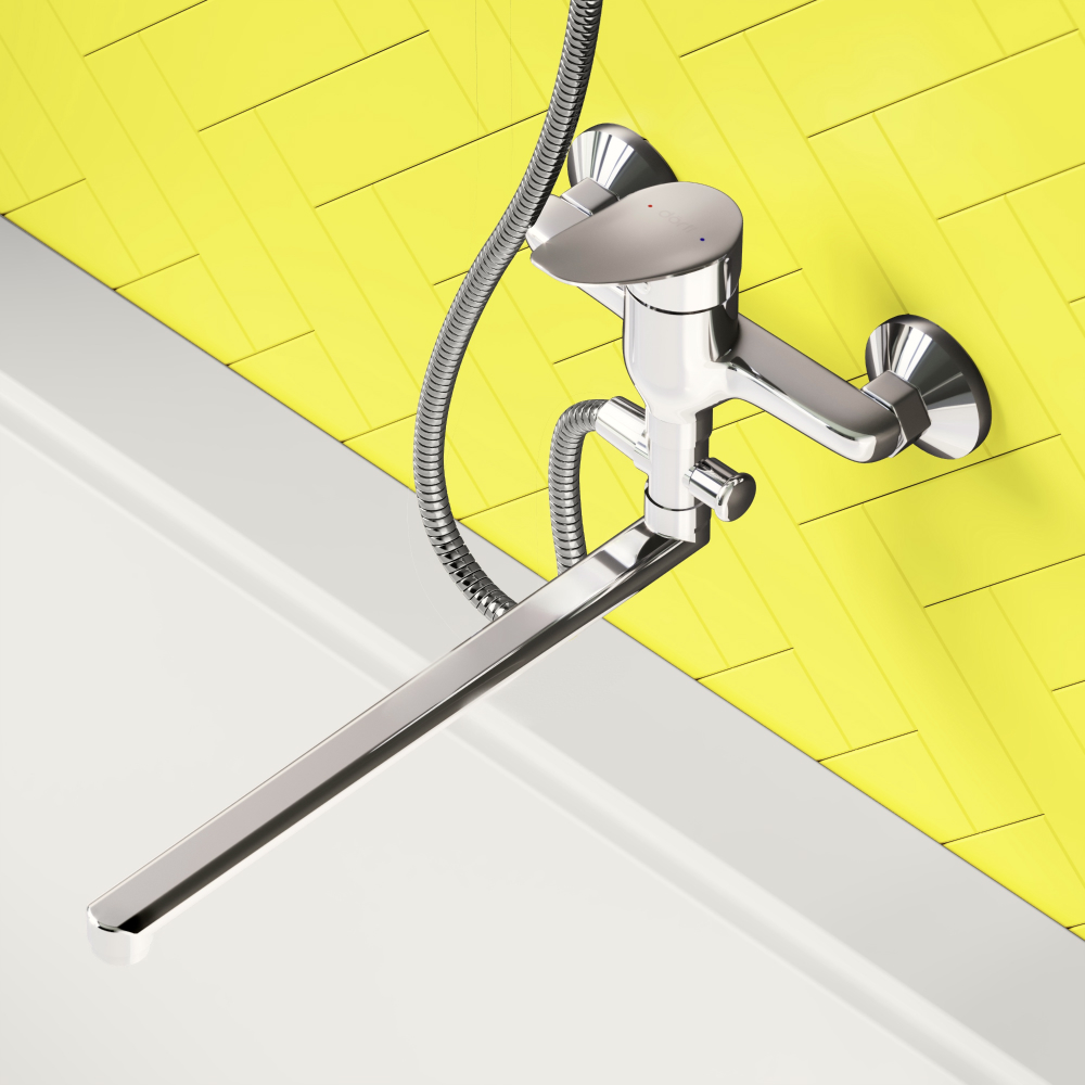 Универсальное решение для ванной комнаты - качественный смеситель для ванны и душа Norma с душевым набором и длинным поворотным изливом который позволяет использовать его как для ванны так и для рядом стоящей раковины.