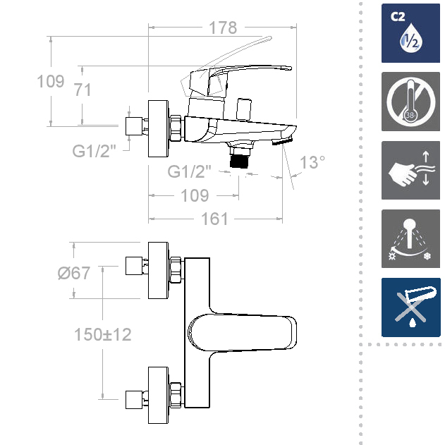 ЭЛЕКТРОСТАТИЧЕСКОЕ покрытие - смеситель приобретает свой цвет в процессе покрытия заряженными частицами краски, проникающими в рельеф корпуса смесителя и образующими долговечное и износостойкое покрытие. S2/C2 - в смесителе применена система двухступенчатого открытия воды, позволяющая сохранять до 50% излишне потребляемой воды. TERMOSTOP BLOCK - внутри смесителя находится настраиваемый механизм, ограничивающий температуру горячей воды, что избавляет пользователя от возможных ожогов. У смесителя настроено заводское значение.
