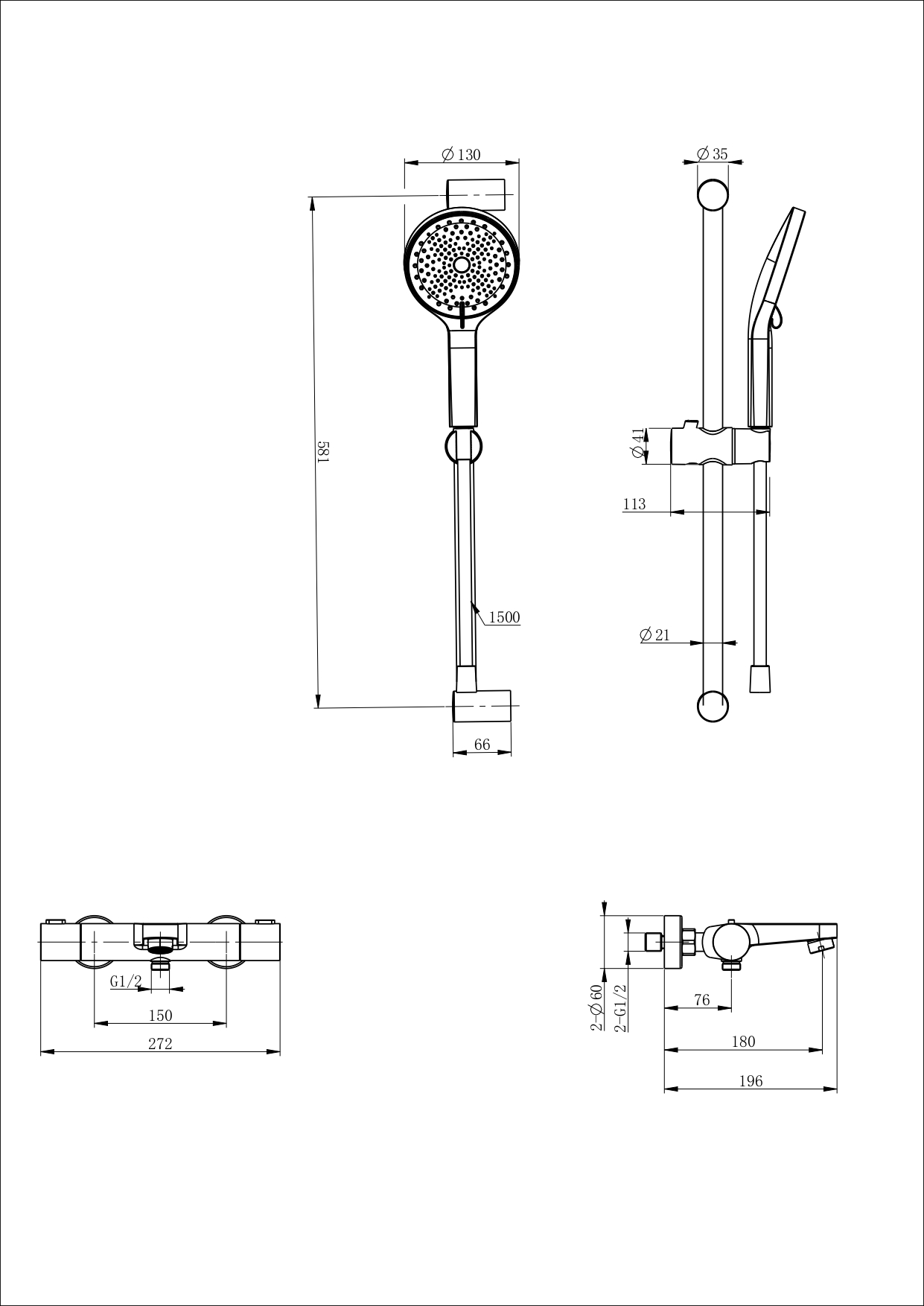 | Оснащение | смеситель / душевой шланг / держатель для душа / душевая штанга / душевая лейка / эксцентрики / монтажный комплект |