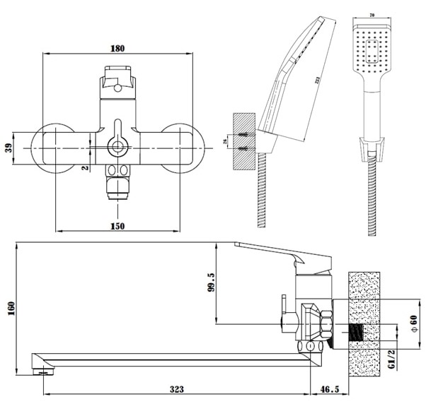 | Оснащение | смеситель / аэратор / эксцентрики / душевой шланг / душевая лейка |