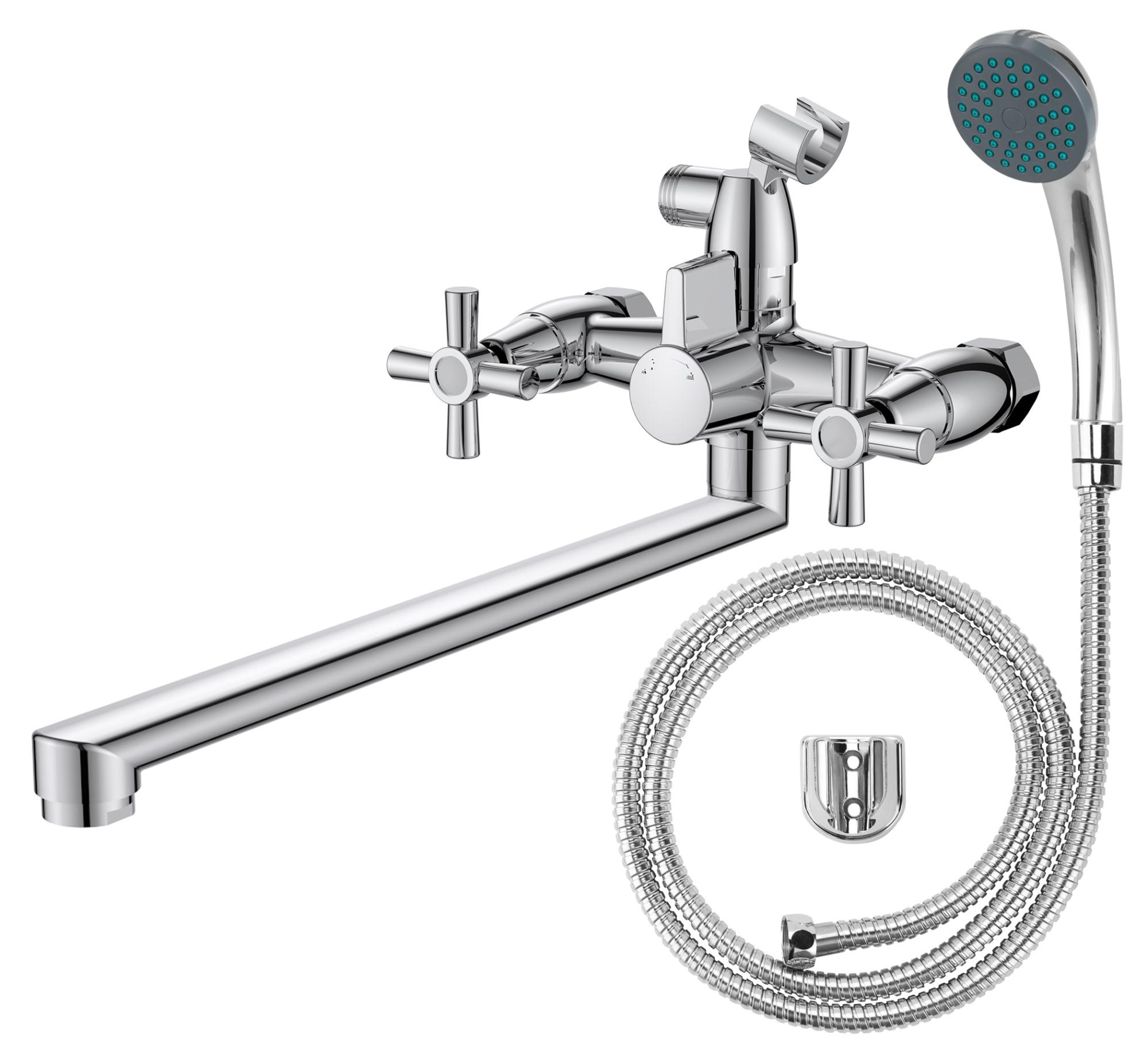 Комплектация : смеситель, чашки, эксцентрики 3/4, паспорт изделия, излив, акссесуары для душа (шланг, лейка, крепеж).