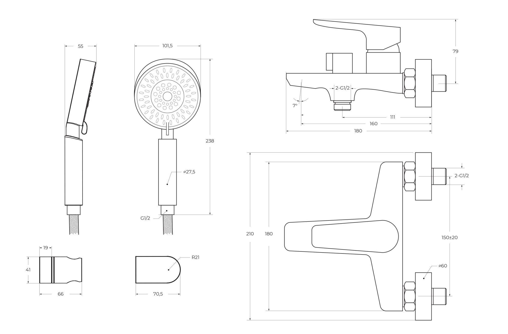 Комплект поставки: смеситель, аэратор, эксцентрики, душевой шланг, душевая лейка, держатель для душа.