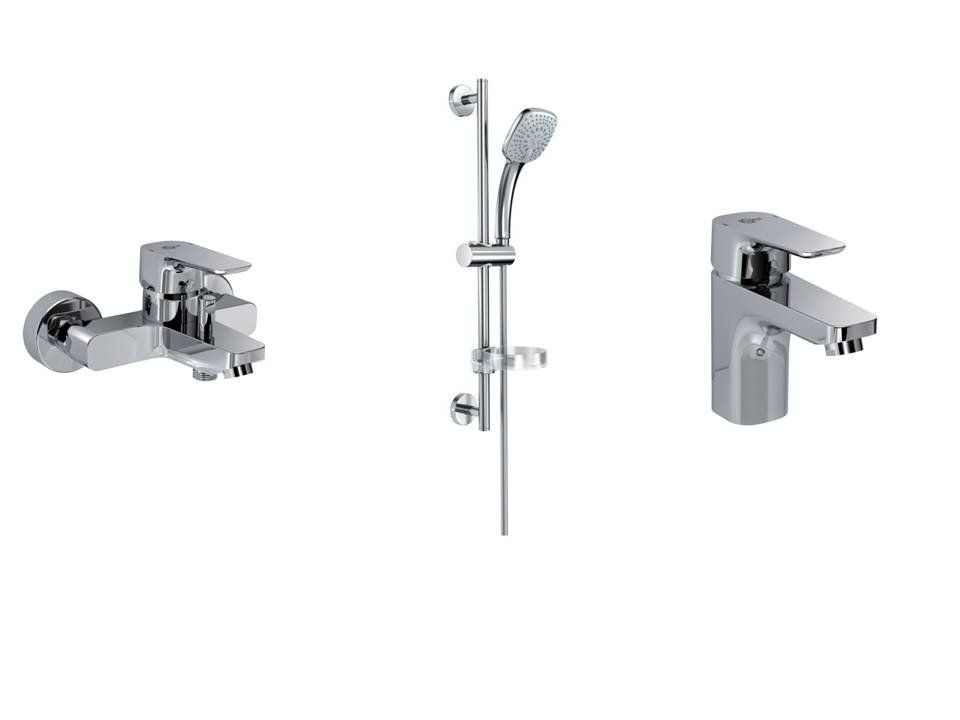 Ideal Standard CERAPLAN III Промо-комплект, состоящий из: B0704AA CERAPLAN III Grande Смеситель для раковины с металлическим донным клапаном, система монтажа EASY-FIX (облегченный монтаж), гибкая подводка G3/8" (шланги PEX), картридж FirmaFlow 38 мм с функцией HWTC (ограничение максимальной температуры горячей воды), с функцией CLICK (ограничение потока воды), металлический донный клапан, металлическая рукоятка с индикаторами горячей / холодной воды, аэратор CASCADE M24 x1; B0718AA CERAPLAN III Настенный смеситель для ванны/душа, стандартный настенный монтаж, металлические накладки, картридж FirmaFlow 38 мм с функцией HWTC (ограничение максимальной температуры горячей воды), с функцией CLICK (ограничение потока воды), без душевого гарнитура, металлическая рукоятка с индикаторами горячей / холодной воды, автоматическое переключение, аэратор CASCADE M24 x1, обратный клапан; B0008AA IDEALRAIN CUBE M3 душевой гарнитур, состоящий из 3-функциональной душевой лейки 100 мм (легкоочищаемая, ограничение потока 8 л/мин), шланга для душа IdealFlex 1750 мм, штанги для душа 60 см ?21 мм (пластиковый слайдер), пластиковой прозрачной мыльницы. Каждое изделие упаковано индивидуально, все три изделия упакованы в одну промо-коробку.
