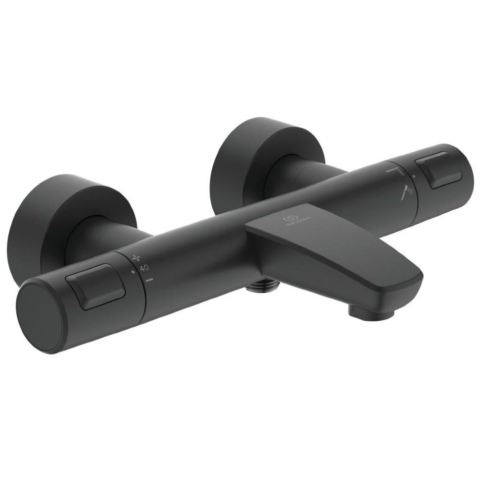 Ideal Standard Ceratherm T25 Настенный термостатический смеситель для ванны/душа, скрытый монтаж на эксцентриках, термостатический картридж IS, новая технология, затворы на керамических дисках G1/2 180?, технология "Cool body" ("Холодный корпус"), пластиковые рукоятки с ограничителями температуры (40?C) и потока воды (50%), встроенный обратный клапан, переключатель интегрирован в корпус, аэратор Perlator
