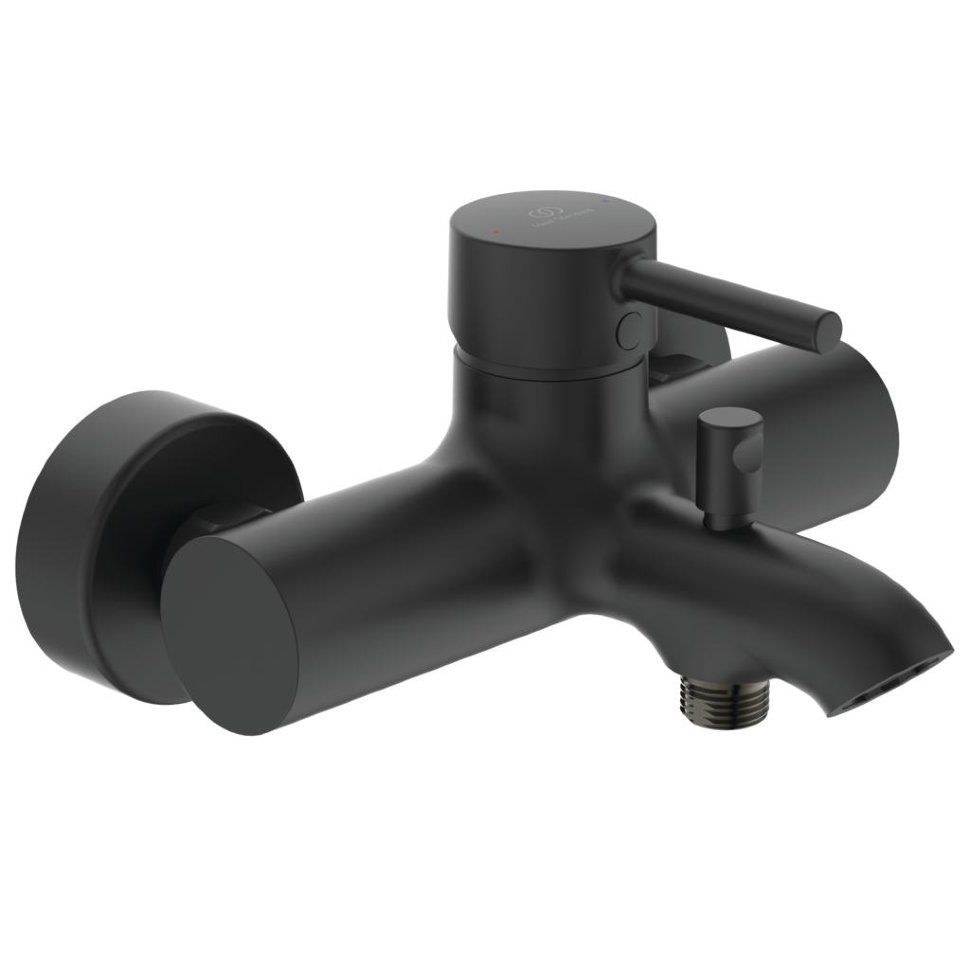Ideal Standard CERALINE Настенный смеситель для ванны/душа, картридж 38 мм FirmaFlow с функцией HWTC (ограничение максимальной температуры горячей воды), аэратор Cashe, монтаж на стандартных эксцентриках (в комплекте: эксцентрики, металлические отражатели, уплотнительные прокладки), металлическая рукоятка с индикаторами горячей / холодной воды, автоматическое переключение ванна/душ, обратный клапан