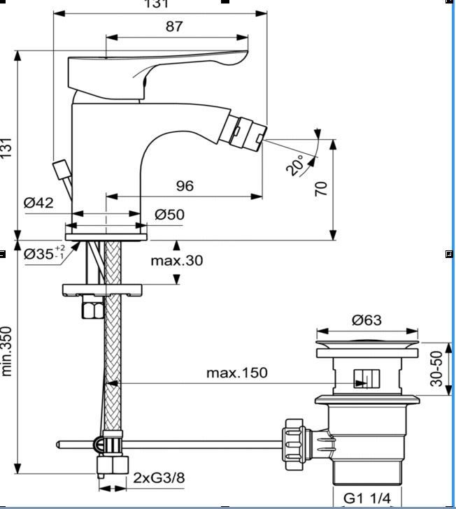 Ideal Standard DOT 2.0 Смеситель для биде, система монтажа EASY-FIX (облегченный монтаж), аэратор Perlator на шаровом шарнире (поворотный), картридж 35 мм с функцией HWTC (ограничение максимальной температуры горячей воды), с функцией CLICK, металлическая рукоятка с индикаторами горячей / холодной воды, гибкая подводка G3/8", пластиковый донный клапан