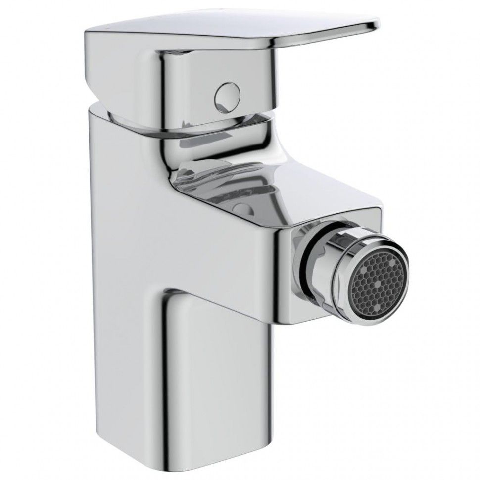 Ideal Standard CERAPLAN Смеситель для биде с металлическим донным клапаном, новая система монтажа EASY-FIX+ (облегченный монтаж), гибкая подводка G3/8", картридж FirmaFlow 38 мм с функцией HWTC (ограничение максимальной температуры горячей воды), металлическая рукоятка с индикаторами горячей / холодной воды, аэратор на шаровом шарнире с ограничением потока 5 л/мин