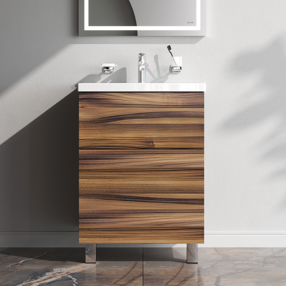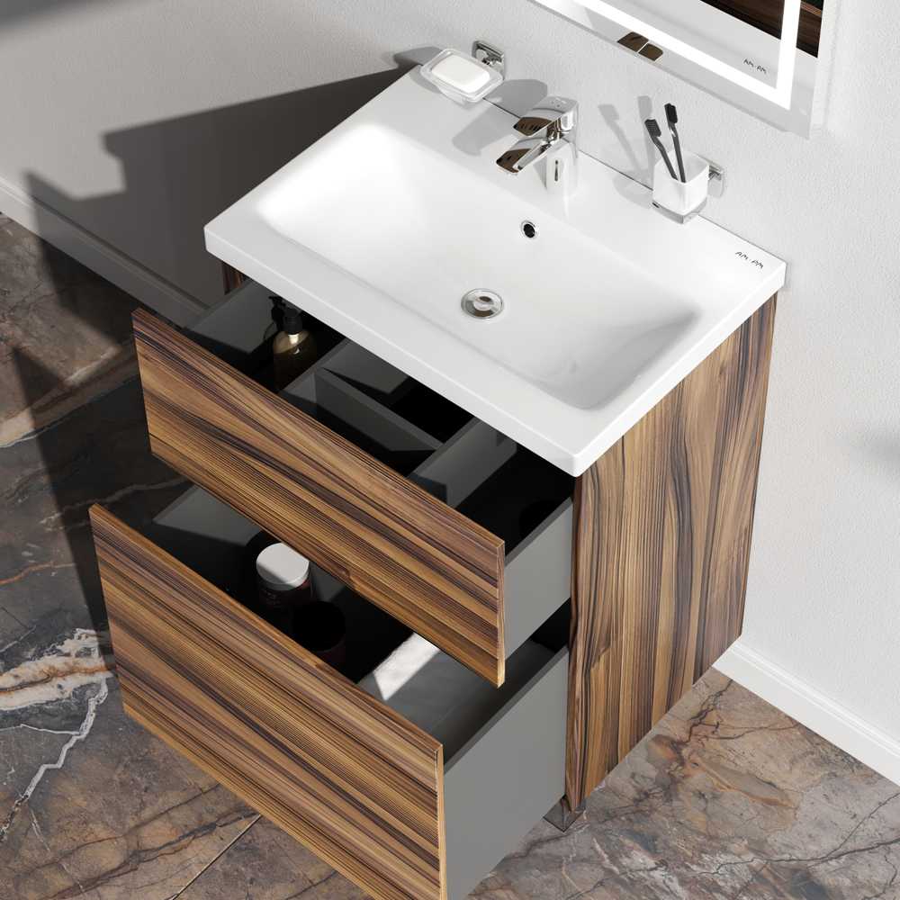 Представляем расширение цветовой палитры коллекции Gem в цвете “орех”. Напольная база под раковину изготовлена из влагостойкого ЛДСП. Внутреннее пространство двух вместительных ящиков представлено в цвете антрацит с антискользящим эффектом.