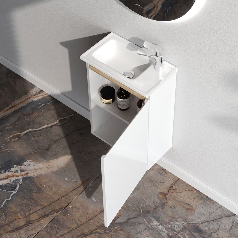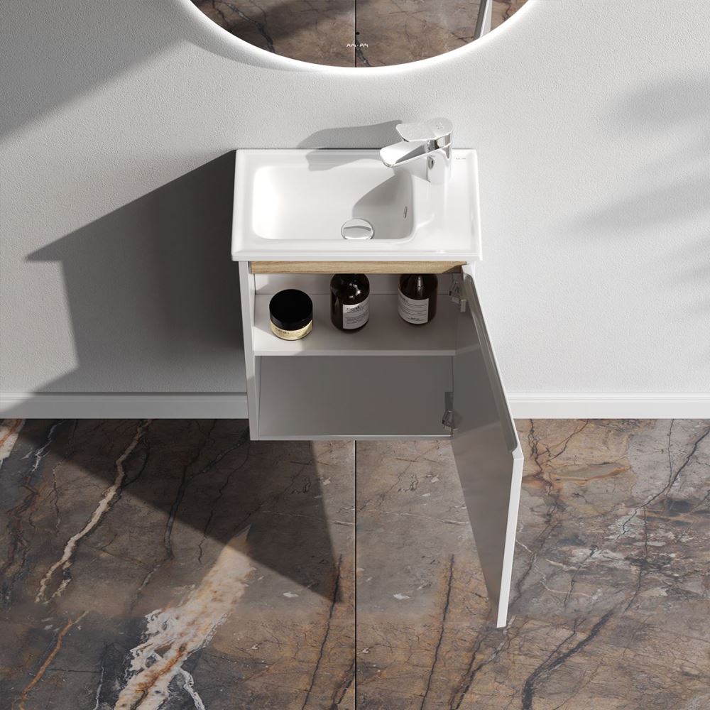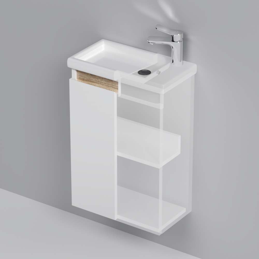 цвете Anthracite и имеет противоскользящее покрытие. Встроенная керамическая раковина белоснежного цвета оснащена специальным бортиком для защиты от пролива воды за мебель.