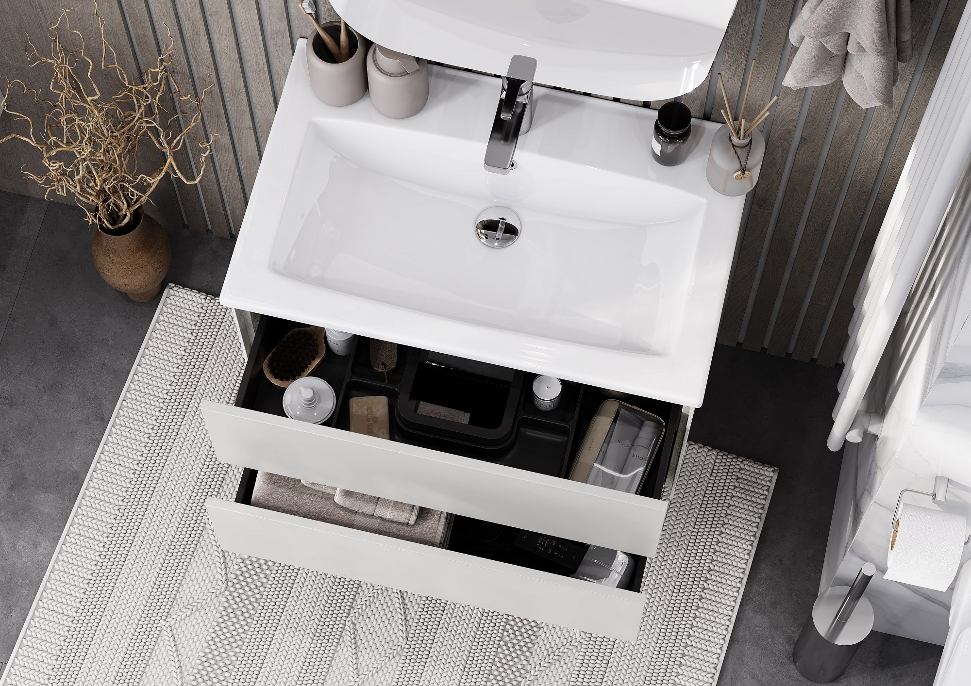 Тумба под раковину AQUATON Сохо — это серия подвесных моделей в современном стиле, доступная в размерах 60, 75 и 100 см. Коллекция представлена в белом глянцевом исполнении, а также в комбинациях цветов «Слэйт/Галька серая» и «Графит софт/Дуб Веллингтон». Все тумбы оснащены дверцами с доводчиками и внутренними полками для практичного и организованного хранения.
