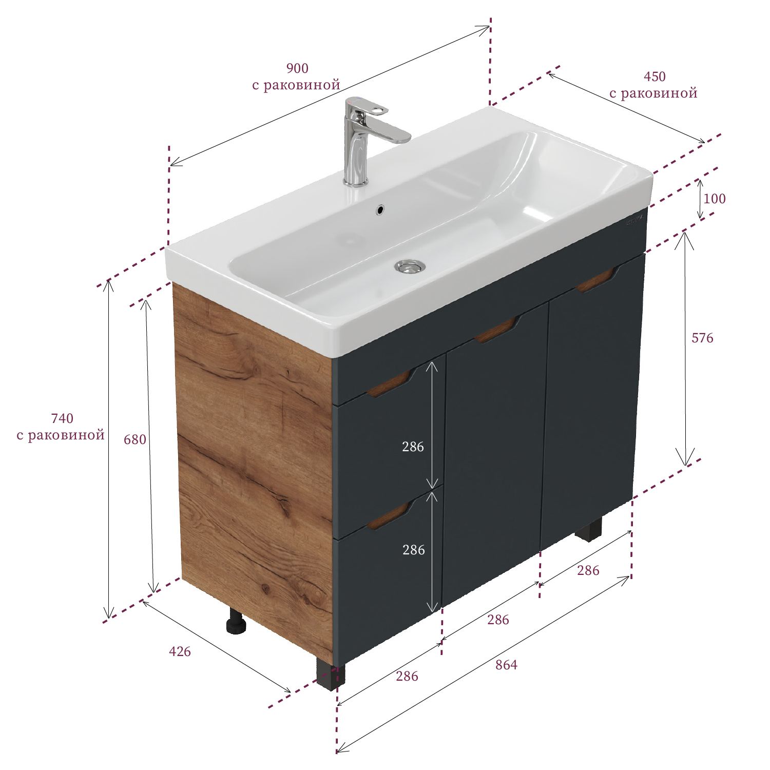 Размеры тумбы без учета раковины и ножек: 86х43х68 см.