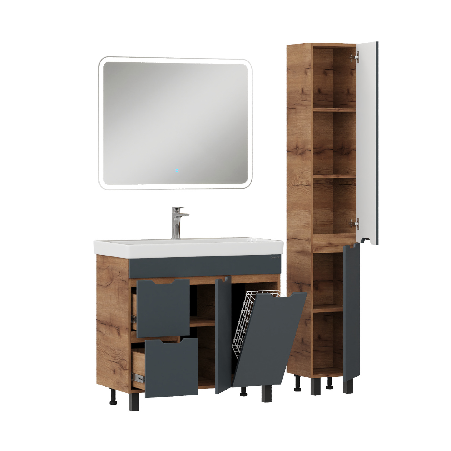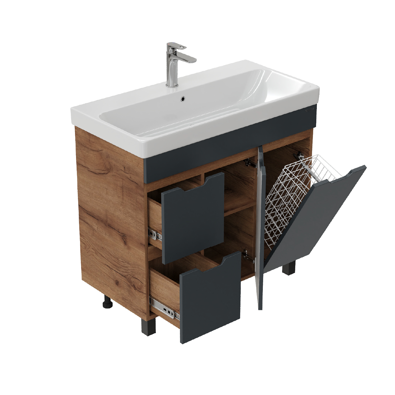 Тумба впишется в любой интерьер благодаря трендовому сочетанию матового графита и золотого дуба, а также поможет эффективно организовать пространство, что особенно важно в небольших ванных комнатах.