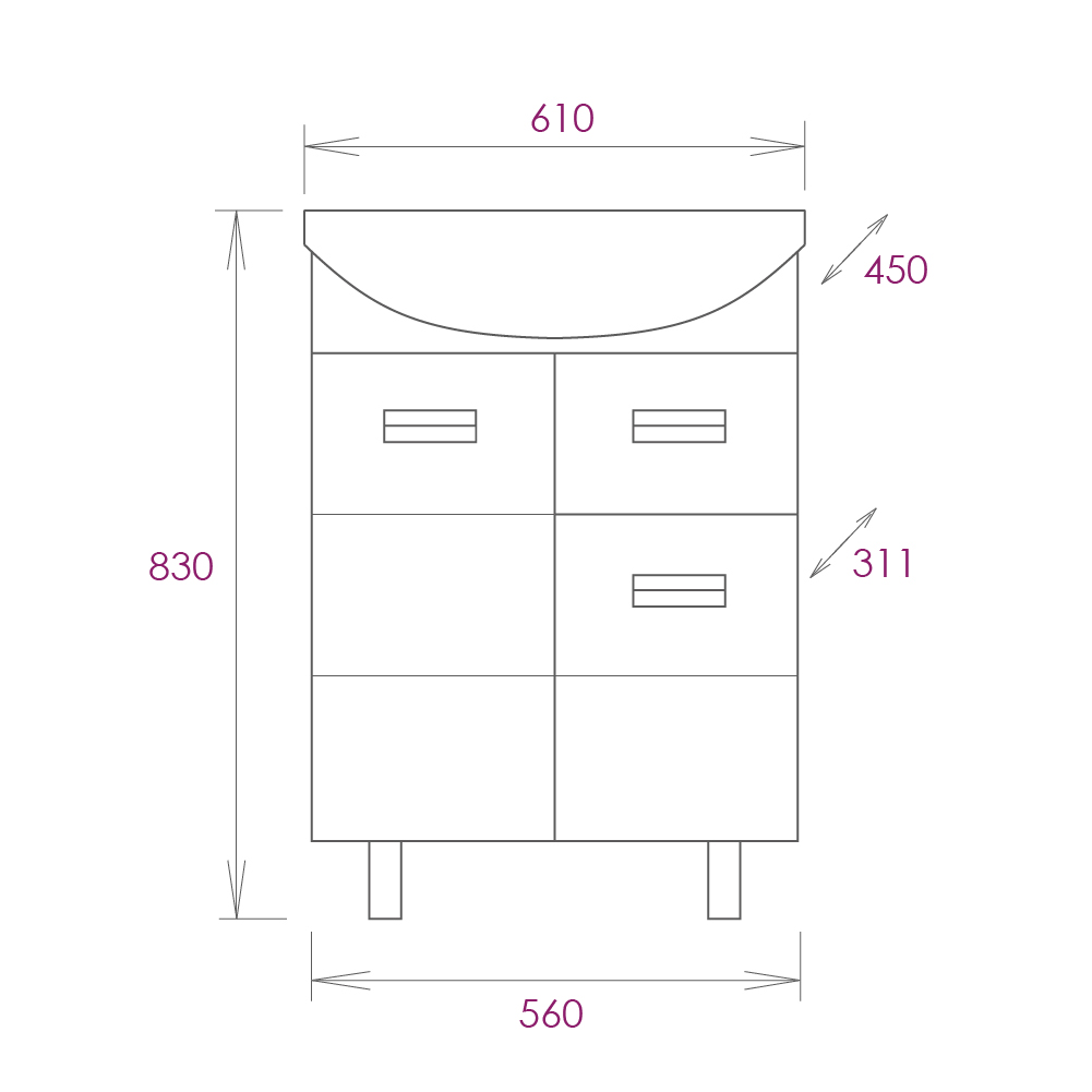 Размеры тумбы без учета раковины и ножек: 56x31x68 см.