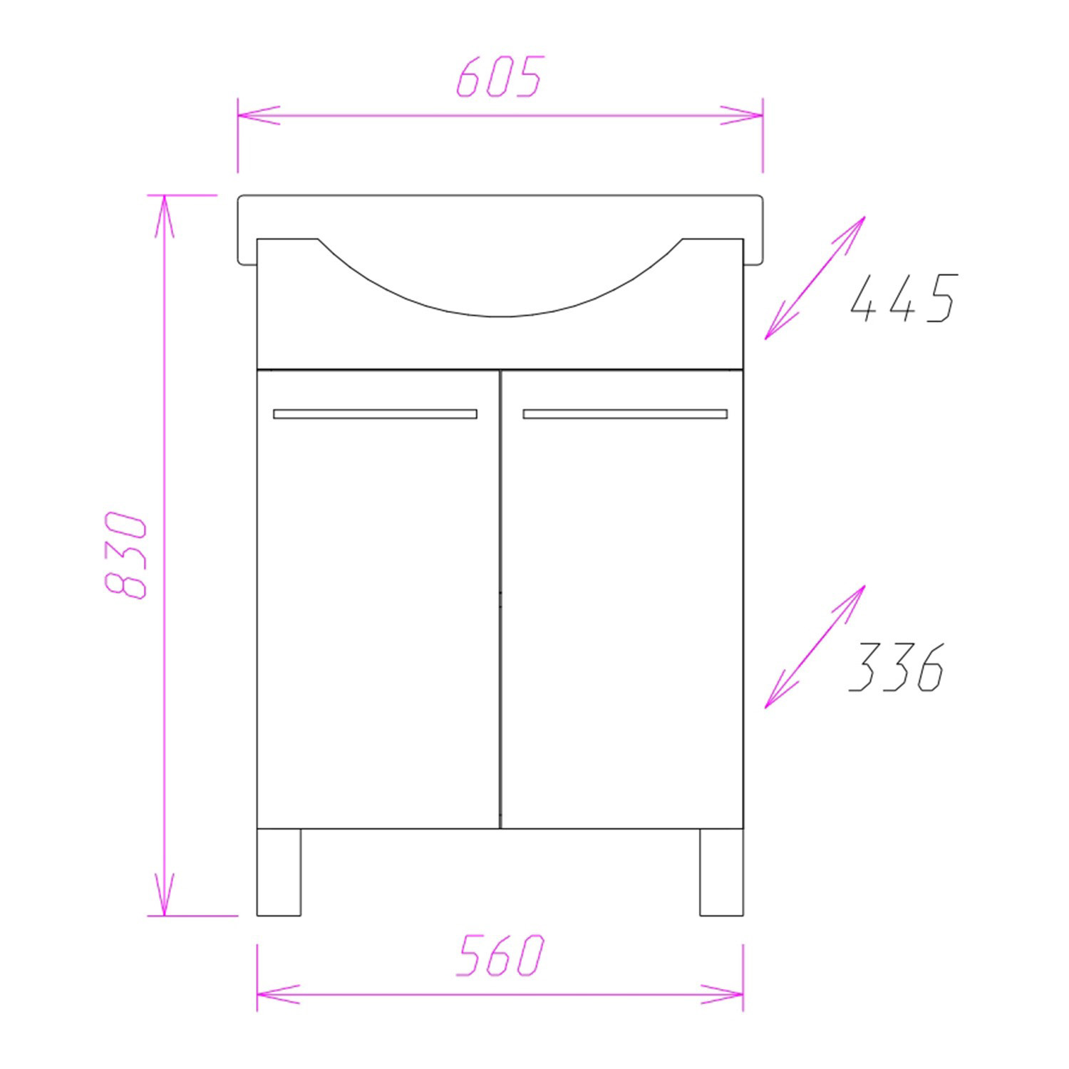 Размеры тумбы без учета раковины и ножек 56x34x68 cм.