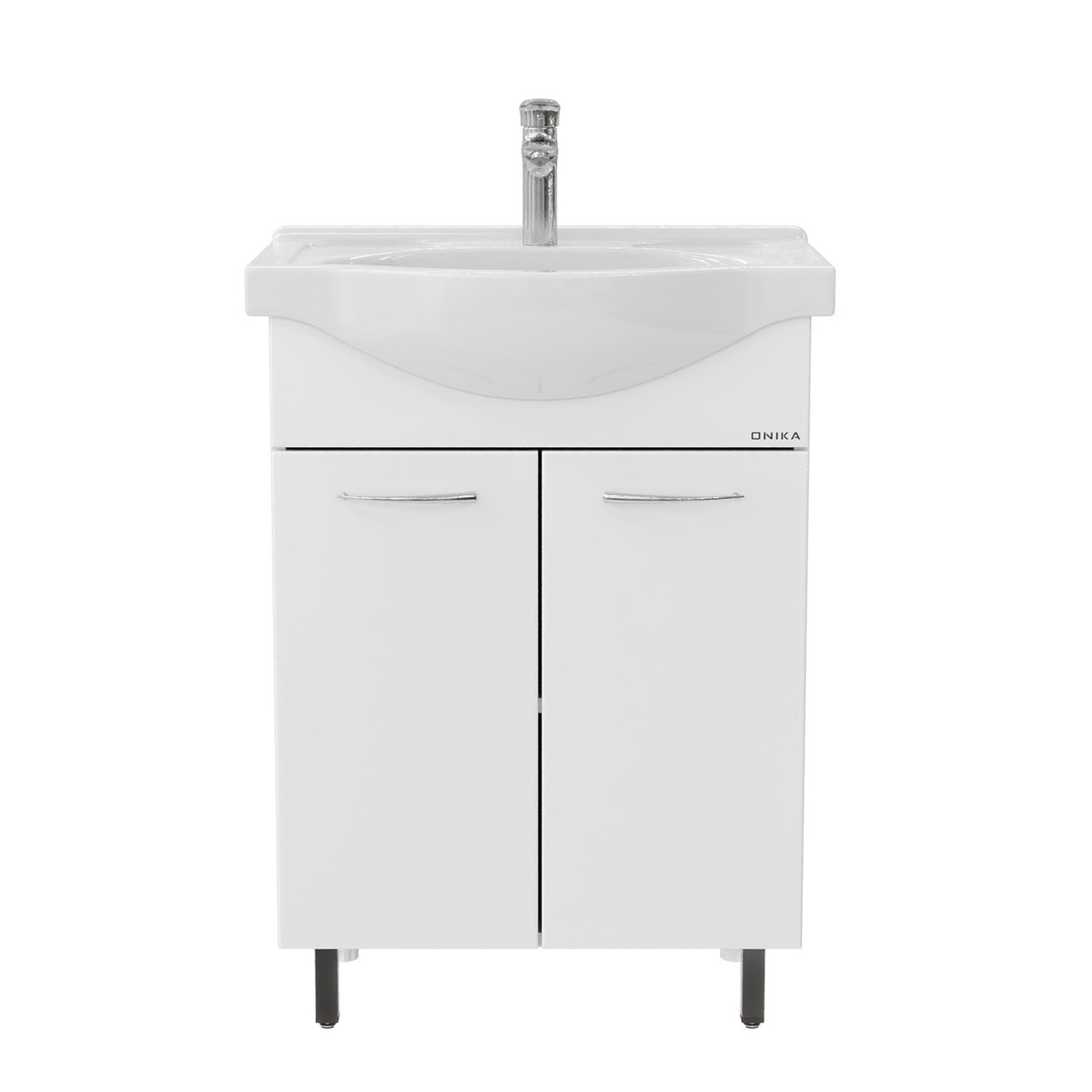 Напольная тумба Onika Селигер 60 - образец простоты и функциональности: классический белый глянцевый цвет, лаконичная форма и оригинальные удлиненные хромированные ручки.