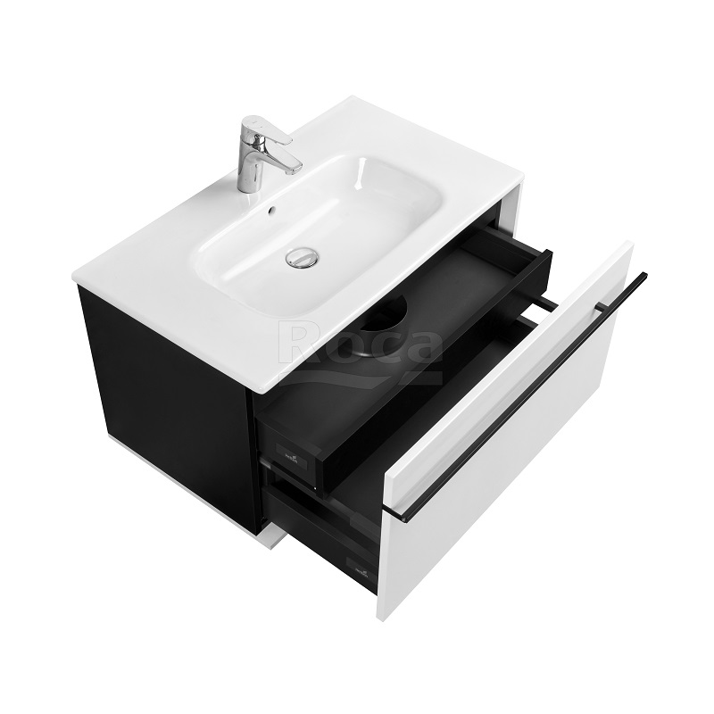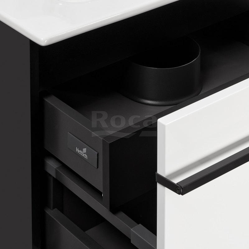 Четкая геометрия линий, сдержанность и широкий функционал – три определения, которые лучше всего описывают коллекцию Aneto. Фасад модуля Aneto размера 800 мм выполнен из MDF, окрашенной в белоснежный глянец, а корпус и левая боковая стенка – из влагостойкой ламинированной плиты в черном цвете. За фасадом находится небольшой внутренний ящик, открывающийся с помощью системы push-to-open и идеально подходящий для хранения небольших мелочей. Вместительный внешний ящик позволит разместить более крупные предметы. Тонкая и изящная ручка в черном матовом цвете подчеркивает графичность дизайна коллекции и может использоваться как полотенцедержатель.
