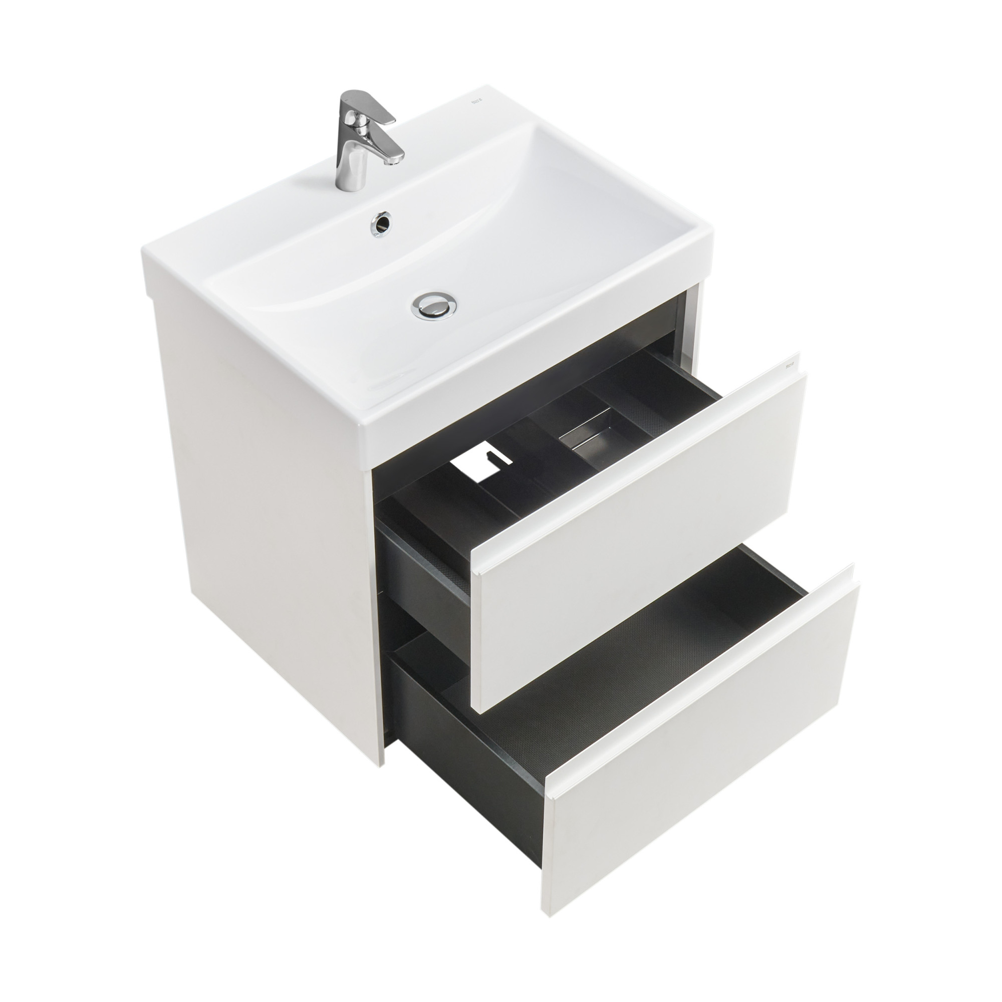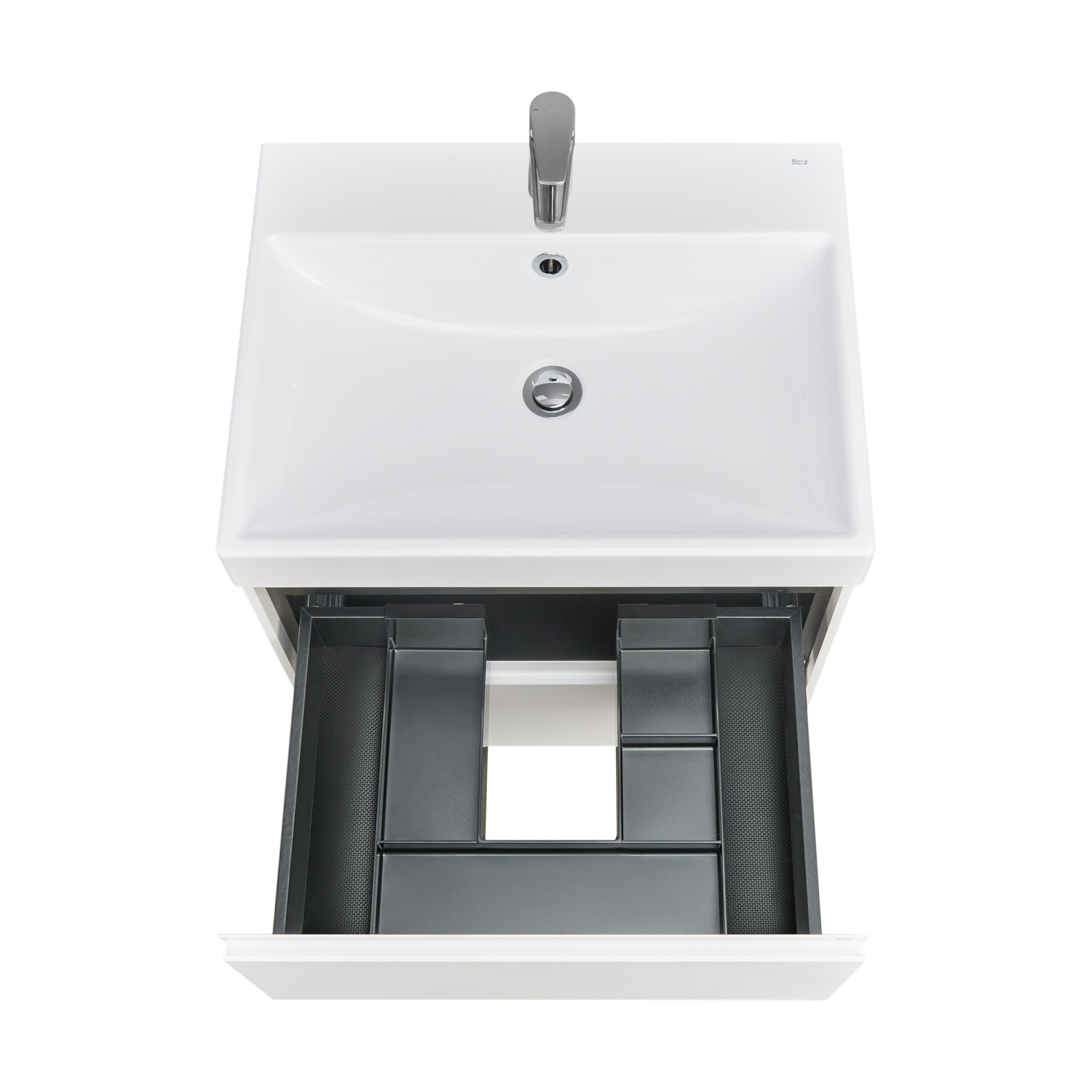 В обоих ящиках находятся противоскользящие коврики, а верхний ящик снабжен также встроенной организацией пространства – эстетика и идеальный порядок в ванной комнате.