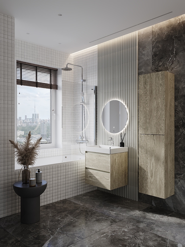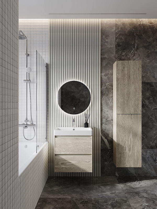В обоих ящиках находятся противоскользящие коврики, а верхний ящик снабжен также встроенной организацией пространства – эстетика и идеальный порядок в ванной комнате.
