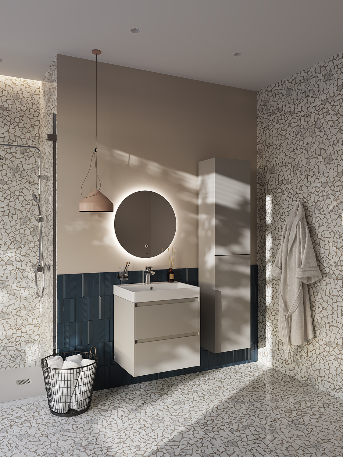 В обоих ящиках находятся противоскользящие коврики, а верхний ящик снабжен также встроенной организацией пространства – эстетика и идеальный порядок в ванной комнате.