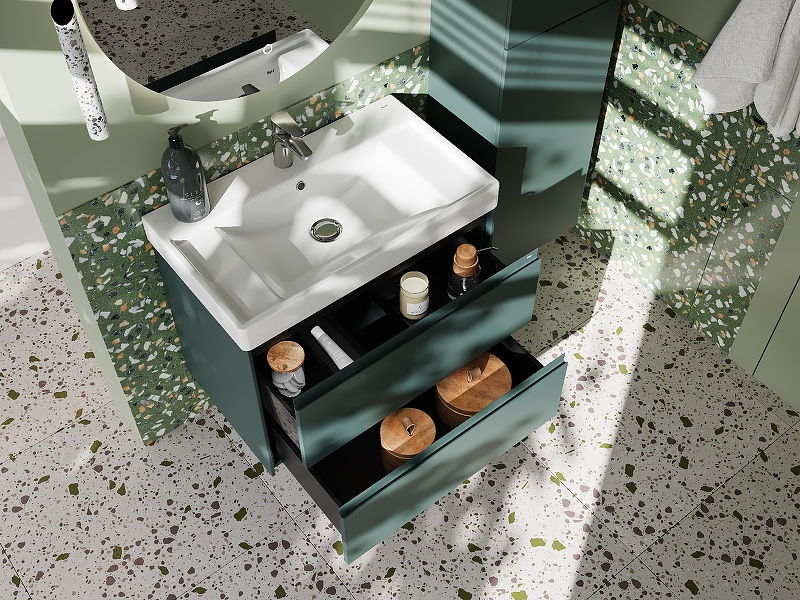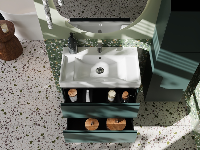 В обоих ящиках находятся противоскользящие коврики, а верхний ящик снабжен также встроенной организацией пространства – эстетика и идеальный порядок в ванной комнате.