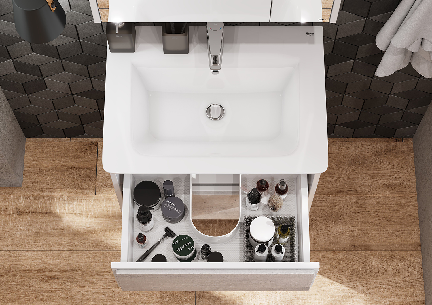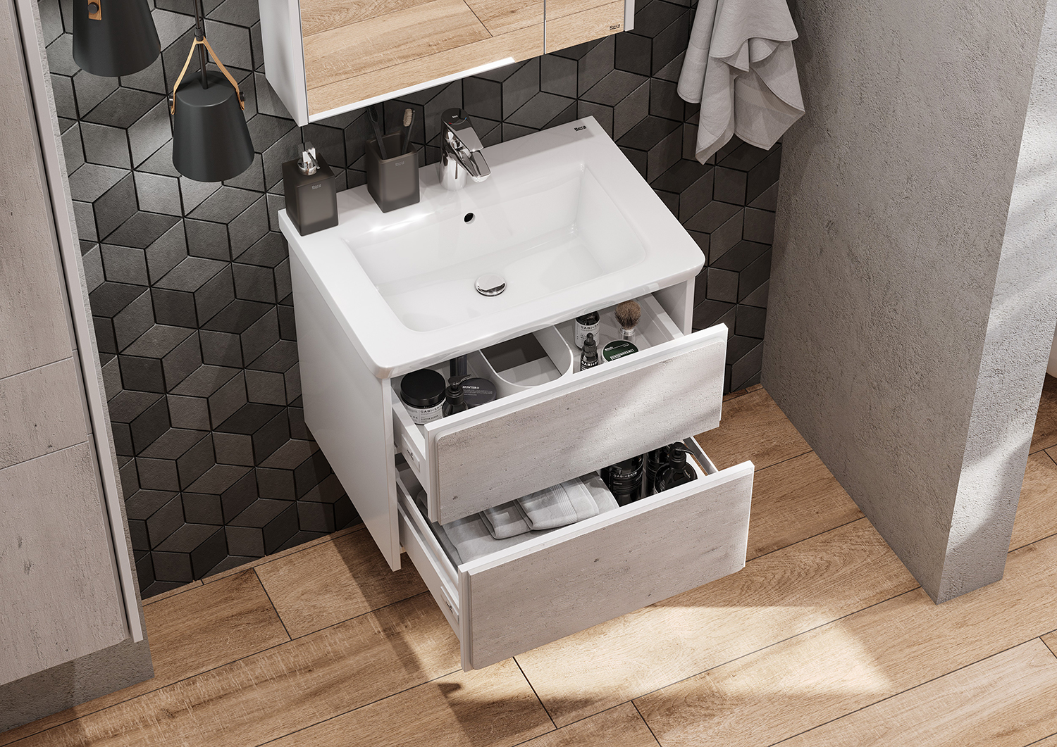 Тумба для раковины Ronda в современном стиле от испанского бренда Roca, выполненная из высококачественной МДФ, с ящиками полного выдвижения с системой push-to-open.