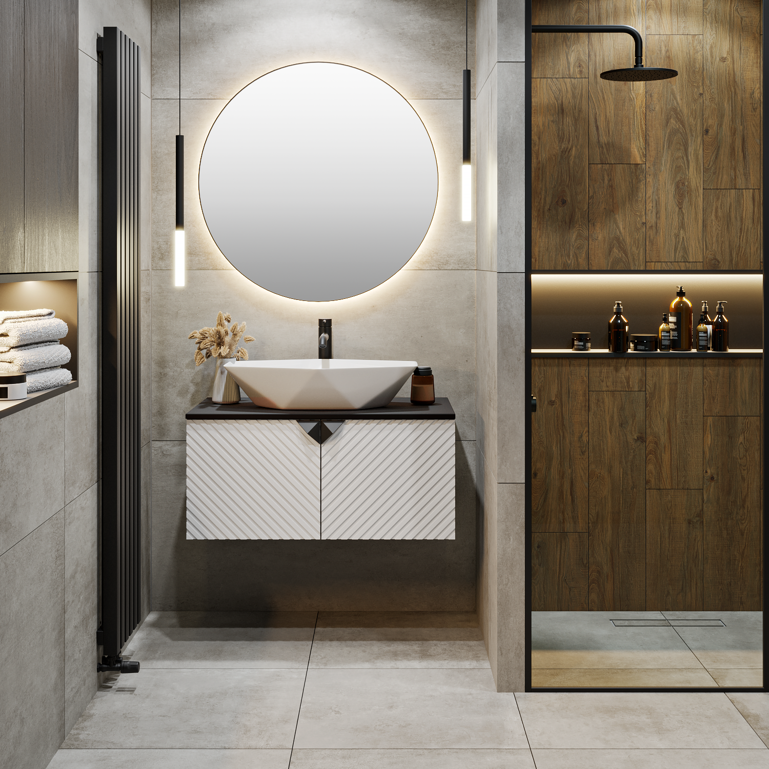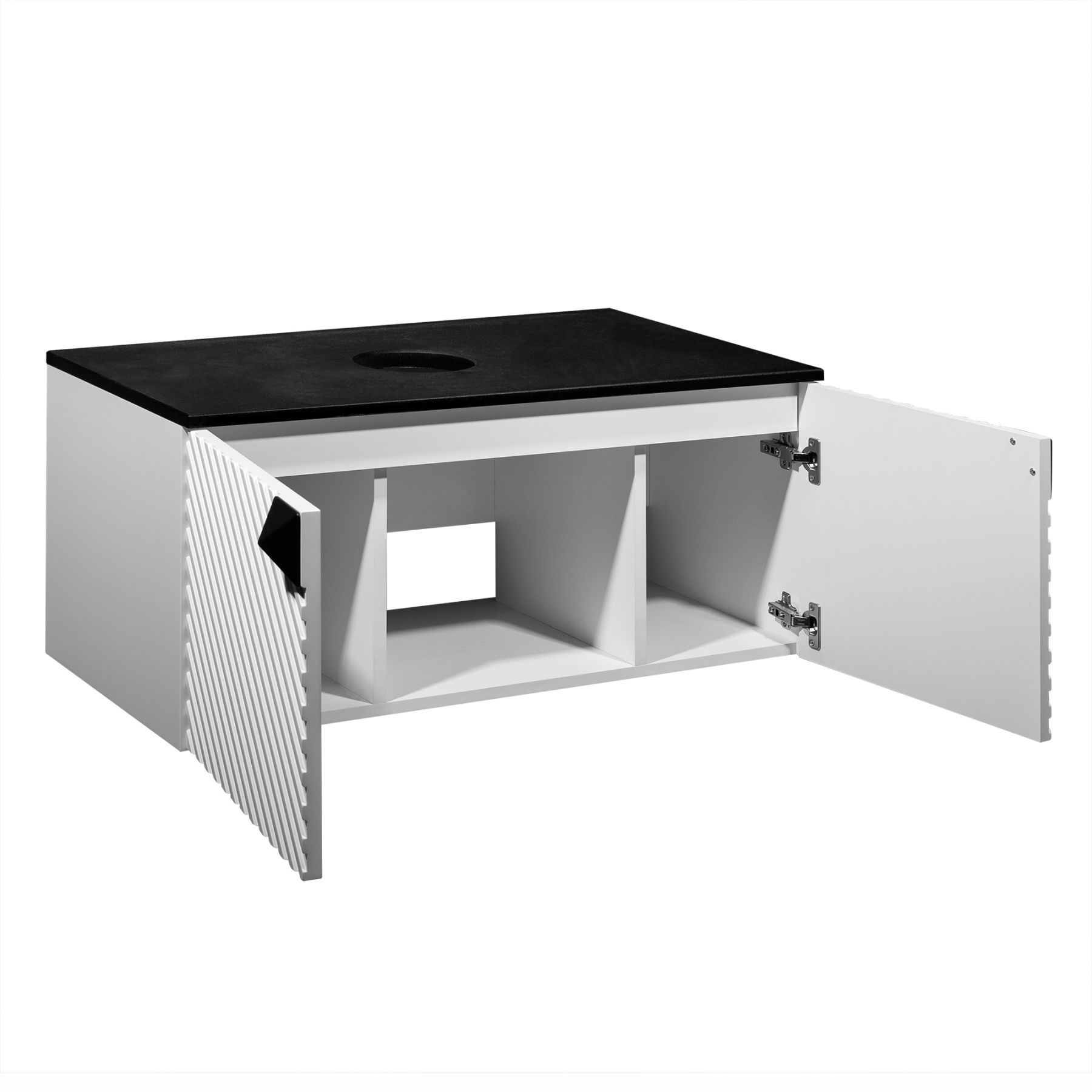 Тумба под раковину в ванную RUNO Андорра (подвесная) – это изысканность и утончённая роскошь в интерьере. Рифленые фасады визуально «оживляют» и «приводят в движение» всю обстановку комнаты, сохраняя при этом умиротворение и покой. Цвета корпуса и фасада имеют идеальное классическое цветовое сочетание белого и чёрного цветов, которые идеально впишутся в любой интерьер ванной комнаты. Тумба с двумя распашными дверцами, дверцы оснащены петлями с доводчиками (верхняя с доводчиком, нижняя без доводчика). В комплекте: 2 ручки, навесы для крепления к стене. К тумбе для ванной подойдут умывальники на столешницу: «OVALE 50» (50х36см) - идеальное решение для стильного интерьера ванной, создан для минималистичных интерьеров и подойдёт для санузлов в стиле лофт, минимализм и хай-тек. Строгая овальная геометрически правильная форма раковины, усиливает идею лаконичности в дизайне, устанавливается на столешницу, накладным методом. «PALLA D41» (диаметр 41см) - идеальное решение для стильного интерьера ванной, создан для минималистичных интерьеров и подойдёт для санузлов в стиле лофт, минимализм и хай-тек. Строгая круглая геометрически правильная форма раковины, усиливает идею лаконичности в дизайне, устанавливается на столешницу, накладным методом. «TRE 48» (48х37см) - идеальное решение для стильного интерьера ванной, создан для минималистичных интерьеров и подойдёт для санузлов в стиле лофт, минимализм и Хай-Тек. Строгая прямоугольная форма с округлыми углами усиливает идею лаконичности в дизайне, устанавливается на столешницу, накладным методом. «TERZO 60» (59х39см) - идеальное решение для стильного интерьера ванной, создан для минималистичных интерьеров и подойдёт для санузлов в стиле лофт, минимализм и хай-тек. Асимметричная раковина, которую можно установить любой стороной, дизайнерское решение для нестандартных интерьеров, усиливает идею лаконичности в дизайне, устанавливается на столешницу, накладным методом. И другие накладные раковины бренда RUNO.