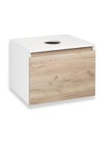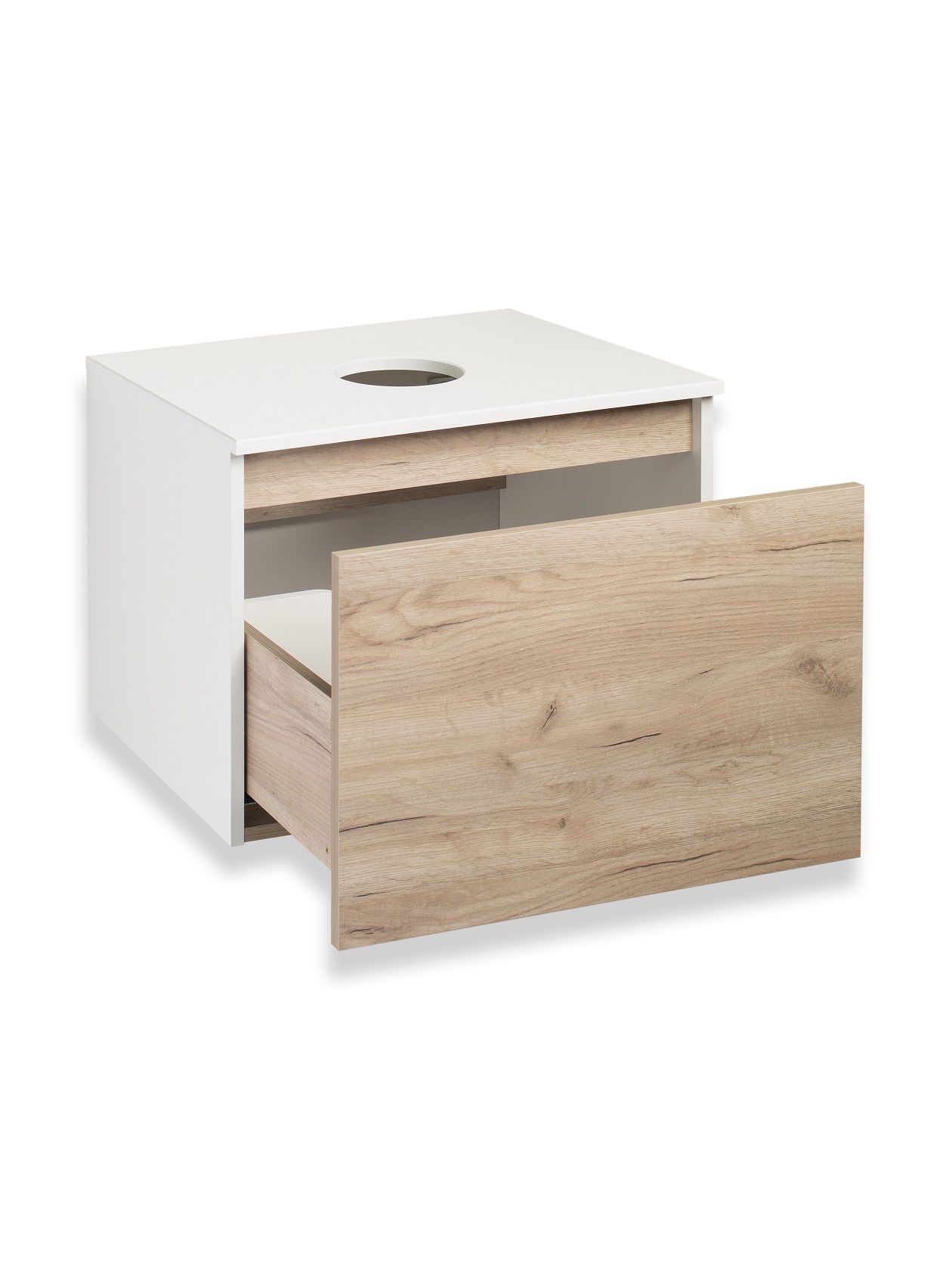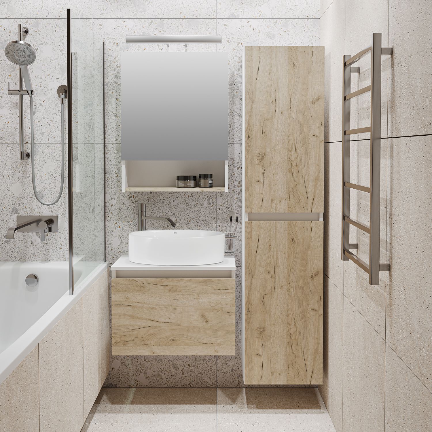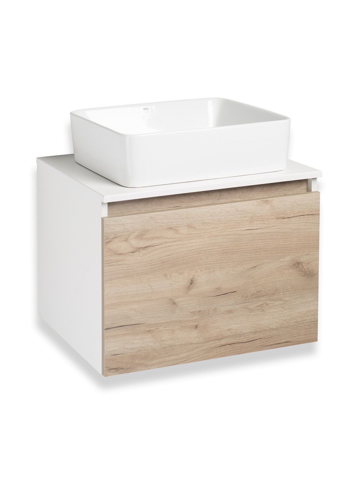 Тумба под раковину БАРИ (подвесная) - безупречное сочетание модных тенденций с классическим оформлением ванной комнаты. Тумба под раковину БАРИ оснащена выдвижным ящиком на направляющих скрытого монтажа, с системой плавного закрывания. Цвет корпуса классический - белый, при этом цвет фасада в модном цвете – крафтовый дуб, идеально впишутся в любой интерьер ванной комнаты. К тумбе для ванной подойдут умывальники на столешницу: «OVALE 50» (50х36см) - идеальное решение для стильного интерьера ванной, создан для минималистичных интерьеров и подойдёт для санузлов в стиле лофт, минимализм и хай-тек. Строгая овальная геометрически правильная форма раковины, усиливает идею лаконичности в дизайне, устанавливается на столешницу, накладным методом. «PALLA D41» (диаметр 41см) - идеальное решение для стильного интерьера ванной, создан для минималистичных интерьеров и подойдёт для санузлов в стиле лофт, минимализм и хай-тек. Строгая круглая геометрически правильная форма раковины, усиливает идею лаконичности в дизайне, устанавливается на столешницу, накладным методом. «TRE 48» (48х37см) - идеальное решение для стильного интерьера ванной, создан для минималистичных интерьеров и подойдёт для санузлов в стиле лофт, минимализм и Хай-Тек. Строгая прямоугольная форма с округлыми углами усиливает идею лаконичности в дизайне, устанавливается на столешницу, накладным методом. «TERZO 60» (59х39см) - идеальное решение для стильного интерьера ванной, создан для минималистичных интерьеров и подойдёт для санузлов в стиле лофт, минимализм и хай-тек. Асимметричная раковина, которую можно установить любой стороной, дизайнерское решение для нестандартных интерьеров, усиливает идею лаконичности в дизайне, устанавливается на столешницу, накладным методом.