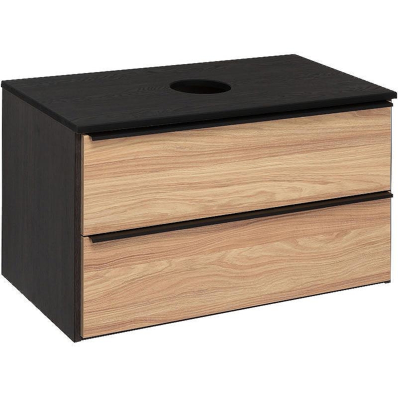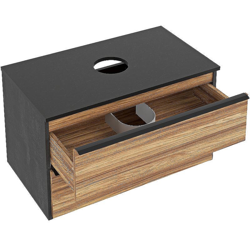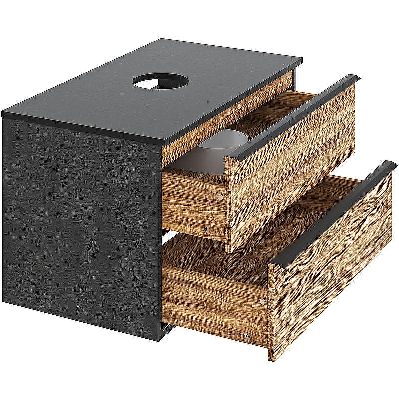 Тумба под раковину Мальта - дизайнерское решение для оформления ванной комнаты. Тумба под раковину Мальта (подвесная) - это стильное сочетание древесной текстуры дуба на фасаде с черным корпусом. Тумба в ванную имеет два выдвижных ящика на направляющих скрытого монтажа, оснащенных системой плавного закрывания. В комплекте идут: две металлических ручки, навесы для крепления к стене. К тумбе для ванной комнаты подходят любые накладные керамические раковины бренда RUNO. Мебель для ванной RUNO - красота и практичность в мелочах!