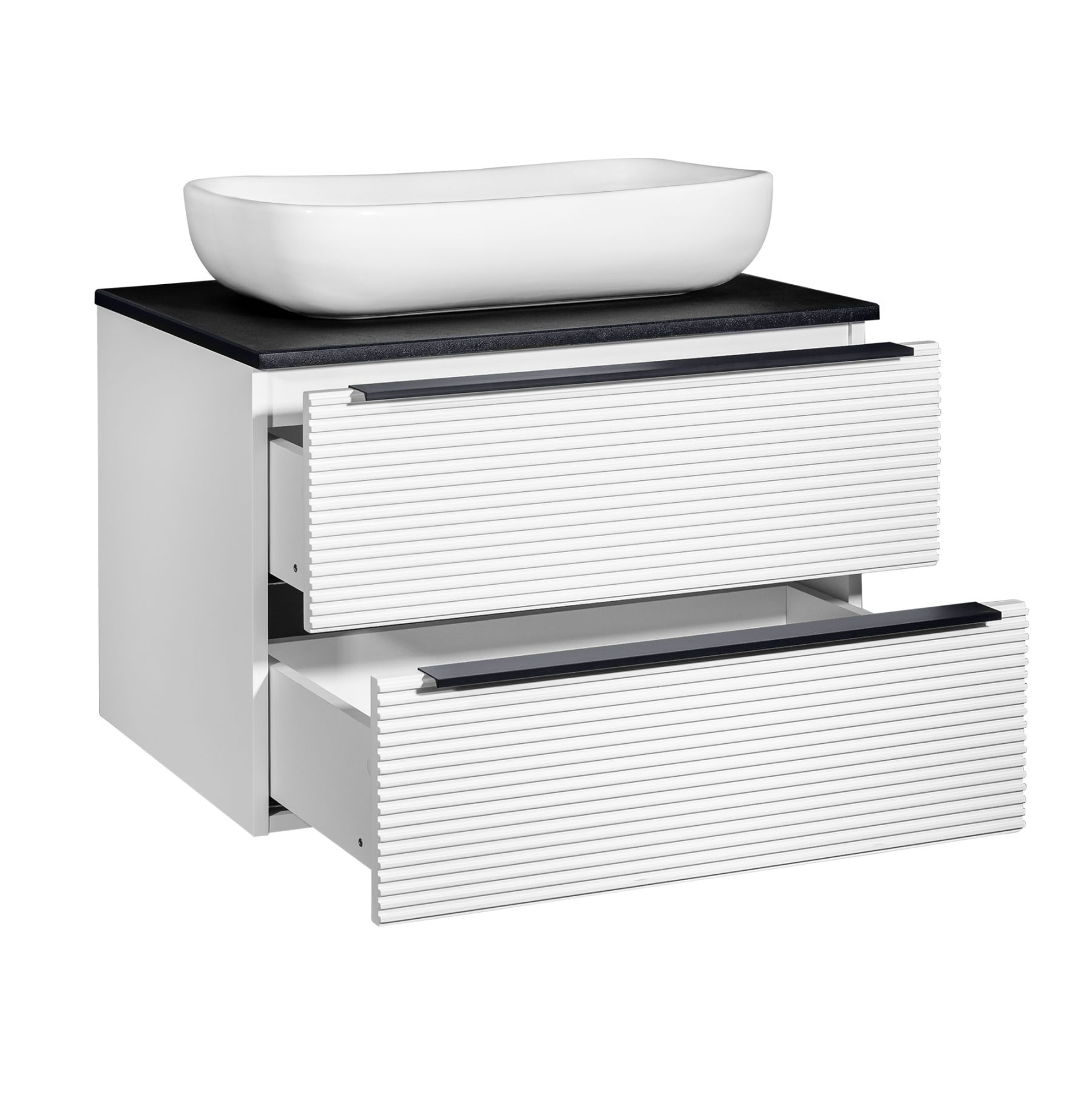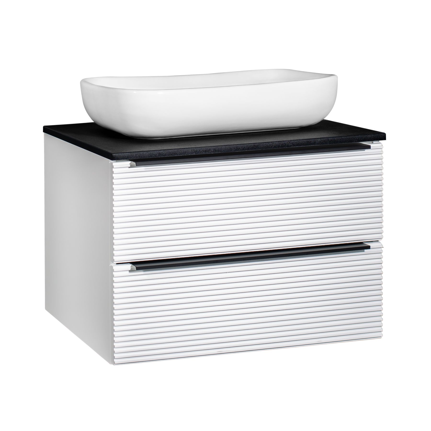 Тумба под раковину в ванную RUNO Орлеан (подвесная) – это изысканность и утончённая роскошь в интерьере. Рифленые фасады визуально «оживляют» и «приводят в движение» всю обстановку комнаты, сохраняя при этом умиротворение и покой. Цвета корпуса и фасада имеют идеальное классическое цветовое сочетание белого и чёрного цветов, которые идеально впишутся в любой интерьер ванной комнаты. Тумба в ванную оснащена двумя выдвижными ящиками на направляющих скрытого монтажа, оборудованных системой плавного закрывания. В комплекте входят: две металлические ручки, навесы для крепления к стене. К тумбе для ванной подойдут умывальники на столешницу: «OVALE 50» (50х36см) - идеальное решение для стильного интерьера ванной, создан для минималистичных интерьеров и подойдёт для санузлов в стиле лофт, минимализм и хай-тек. Строгая овальная геометрически правильная форма раковины, усиливает идею лаконичности в дизайне, устанавливается на столешницу, накладным методом. «PALLA D41» (диаметр 41см) - идеальное решение для стильного интерьера ванной, создан для минималистичных интерьеров и подойдёт для санузлов в стиле лофт, минимализм и хай-тек. Строгая круглая геометрически правильная форма раковины, усиливает идею лаконичности в дизайне, устанавливается на столешницу, накладным методом. «TRE 48» (48х37см) - идеальное решение для стильного интерьера ванной, создан для минималистичных интерьеров и подойдёт для санузлов в стиле лофт, минимализм и Хай-Тек. Строгая прямоугольная форма с округлыми углами усиливает идею лаконичности в дизайне, устанавливается на столешницу, накладным методом. «TERZO 60» (59х39см) - идеальное решение для стильного интерьера ванной, создан для минималистичных интерьеров и подойдёт для санузлов в стиле лофт, минимализм и хай-тек. Асимметричная раковина, которую можно установить любой стороной, дизайнерское решение для нестандартных интерьеров, усиливает идею лаконичности в дизайне, устанавливается на столешницу, накладным методом. И другие накладные раковины бренда RUNO.