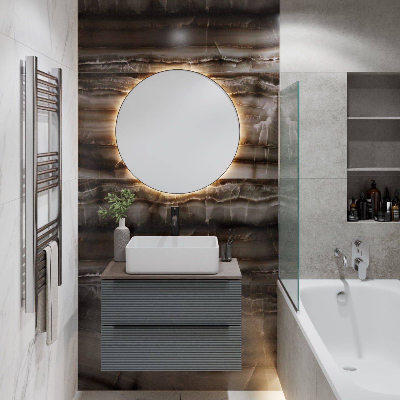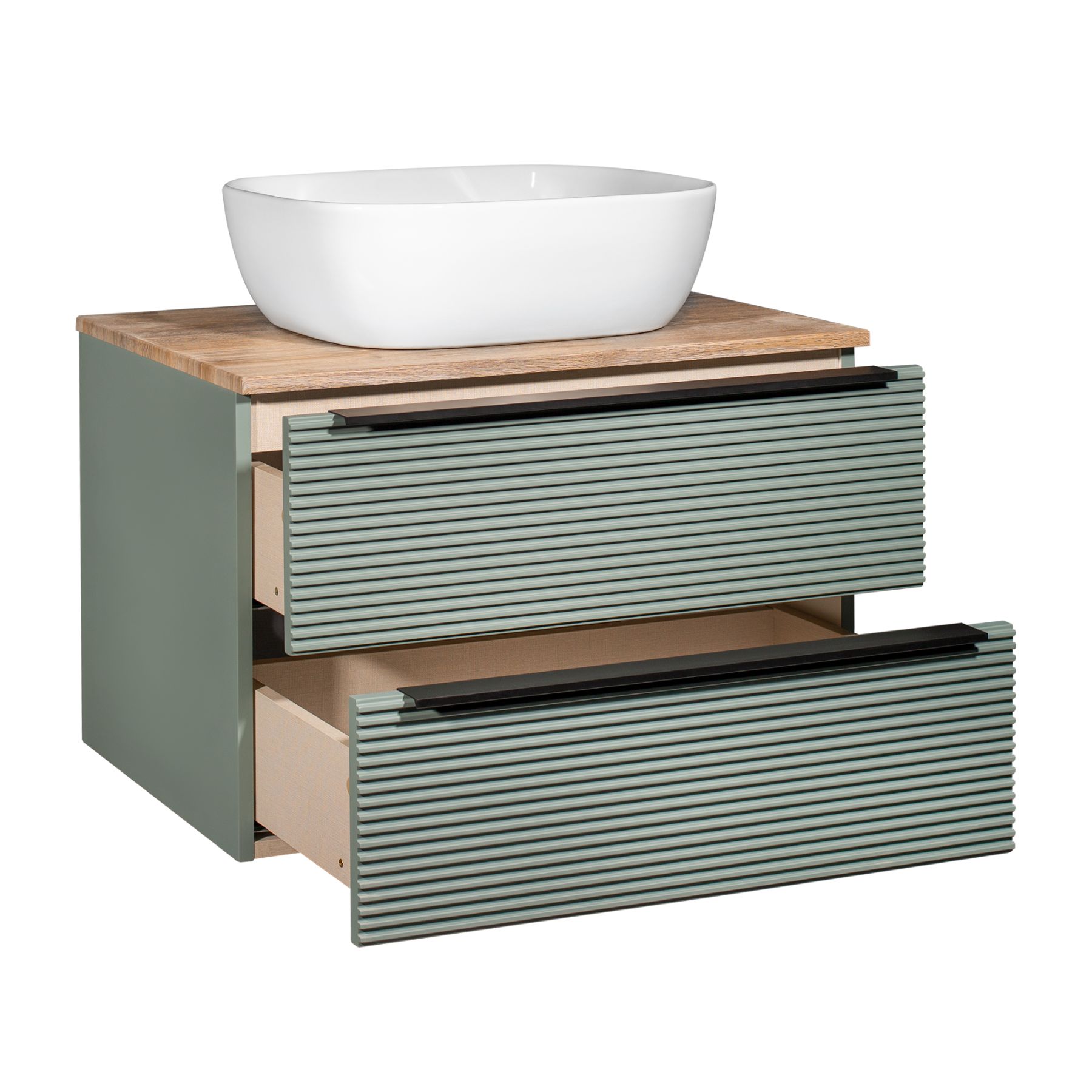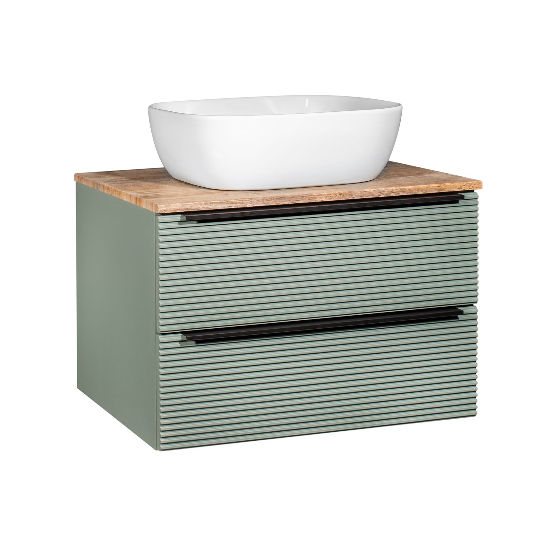 Тумба под раковину в ванную RUNO Орлеан (подвесная) – это изысканность и утончённая роскошь в интерьере. Рифленые фасады визуально «оживляют» и «приводят в движение» всю обстановку комнаты, сохраняя при этом умиротворение и покой. Цвета корпуса и фасада имеют идеальное цветовое сочетание оливкового цвета и цвета натурального дуба, которые идеально впишутся в любой интерьер ванной комнаты. Тумба в ванную оснащена двумя выдвижными ящиками на направляющих скрытого монтажа, оборудованных системой плавного закрывания. В комплекте входят: две металлические ручки, навесы для крепления к стене. К тумбе для ванной подойдут умывальники на столешницу: «OVALE 50» (50х36см) - идеальное решение для стильного интерьера ванной, создан для минималистичных интерьеров и подойдёт для санузлов в стиле лофт, минимализм и хай-тек. Строгая овальная геометрически правильная форма раковины, усиливает идею лаконичности в дизайне, устанавливается на столешницу, накладным методом. «PALLA D41» (диаметр 41см) - идеальное решение для стильного интерьера ванной, создан для минималистичных интерьеров и подойдёт для санузлов в стиле лофт, минимализм и хай-тек. Строгая круглая геометрически правильная форма раковины, усиливает идею лаконичности в дизайне, устанавливается на столешницу, накладным методом. «TRE 48» (48х37см) - идеальное решение для стильного интерьера ванной, создан для минималистичных интерьеров и подойдёт для санузлов в стиле лофт, минимализм и Хай-Тек. Строгая прямоугольная форма с округлыми углами усиливает идею лаконичности в дизайне, устанавливается на столешницу, накладным методом. «TERZO 60» (59х39см) - идеальное решение для стильного интерьера ванной, создан для минималистичных интерьеров и подойдёт для санузлов в стиле лофт, минимализм и хай-тек. Асимметричная раковина, которую можно установить любой стороной, дизайнерское решение для нестандартных интерьеров, усиливает идею лаконичности в дизайне, устанавливается на столешницу, накладным методом. И другие накладные раковины бренда RUNO.