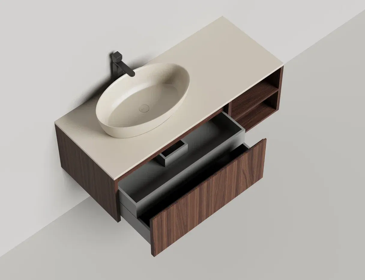 Domino Игра по вашим правилам Подвесная тумба Domino предназначена для установки со встроенными или накладными раковинами Salini. Она отличается современным дизайном и привлекательным внешним видом. Гладкие и рельефные фасады ящиков в шпоне дерева, глянцевом или матовом лаке позволяют подобрать комбинацию подходящего размера (ширина от 80 до 200 см) и наполнения. В сочетание со столешницей Costa из каменного литья S-Stone со встроенной или накладной раковиной создадут практичность и расширят функционал повседневного использования, а также гарантируют простоту ухода. Domino — беспроигрышное решение для любого интерьера. Глубина тумбы составляет 50см, высота 40см