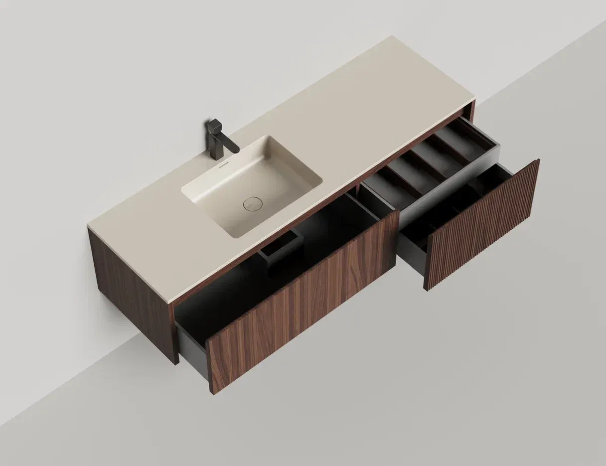 Domino Игра по вашим правилам Подвесная тумба Domino предназначена для установки со встроенными или накладными раковинами Salini. Она отличается современным дизайном и привлекательным внешним видом. Гладкие и рельефные фасады ящиков в шпоне дерева, глянцевом или матовом лаке позволяют подобрать комбинацию подходящего размера (ширина от 80 до 200 см) и наполнения. В сочетание со столешницей Costa из каменного литья S-Stone со встроенной или накладной раковиной создадут практичность и расширят функционал повседневного использования, а также гарантируют простоту ухода. Domino — беспроигрышное решение для любого интерьера. Глубина тумбы составляет 50см, высота 40см