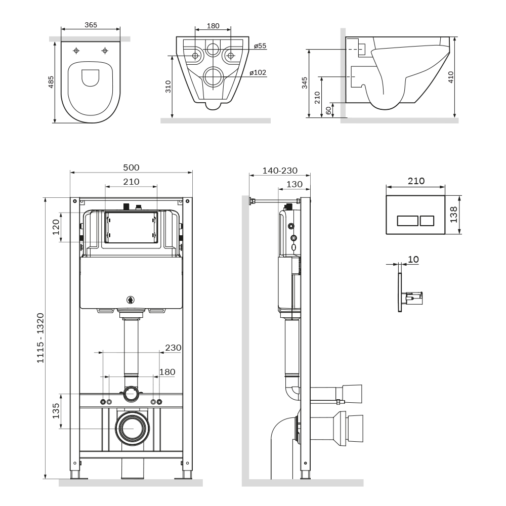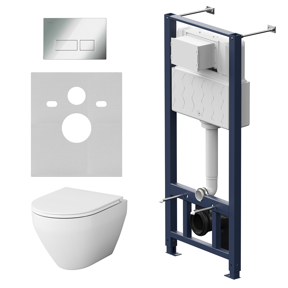 Полностью готовый к установке комплект: система инсталляции с клавишей подвесной унитаз сиденьем.