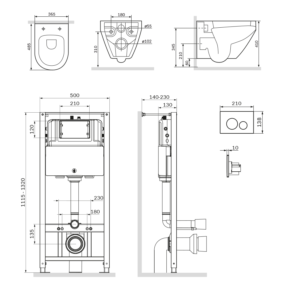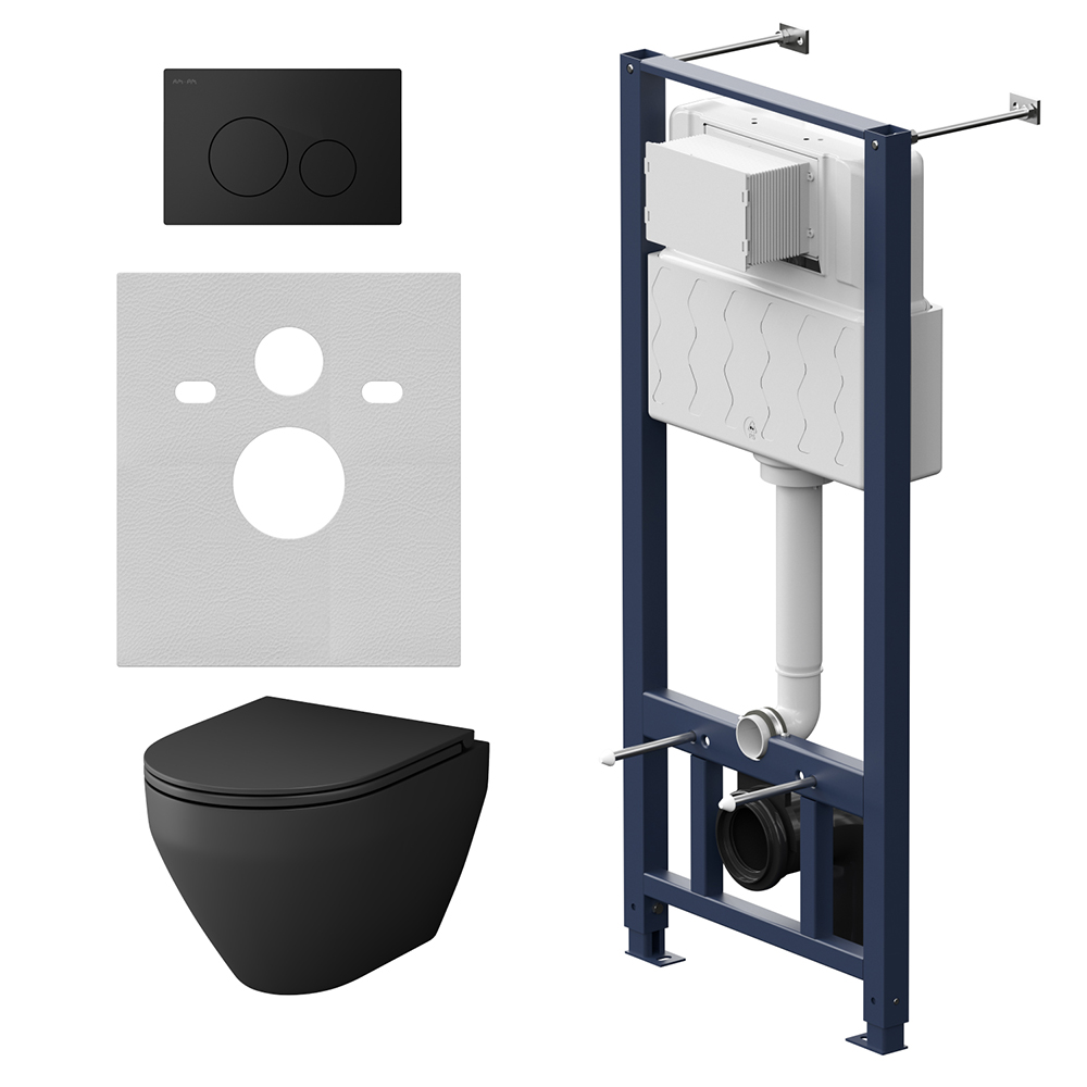 Комплект поставки: инсталляция, бачок, унитаз, кнопка смыва, крышка-сиденье, звукоизолирующая прокладка.