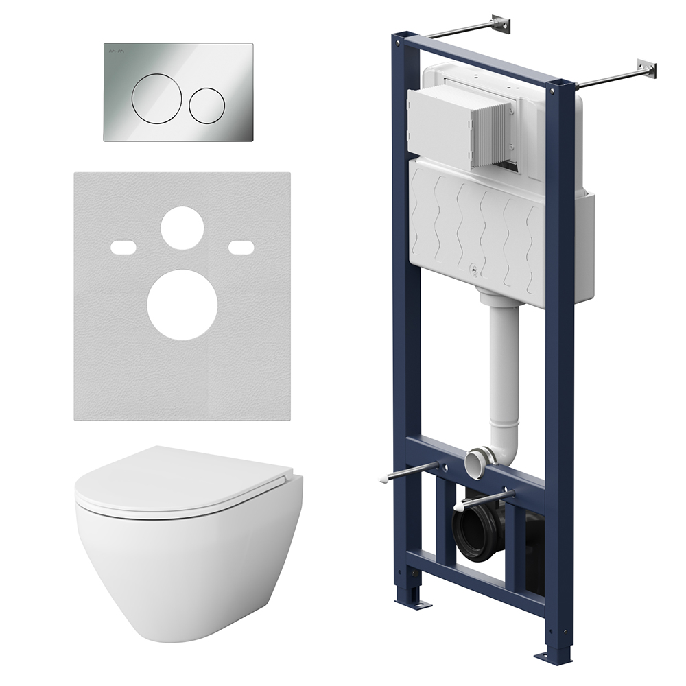 Комплект поставки: инсталляция, бачок, унитаз, кнопка смыва, крышка-сиденье, звукоизолирующая прокладка.