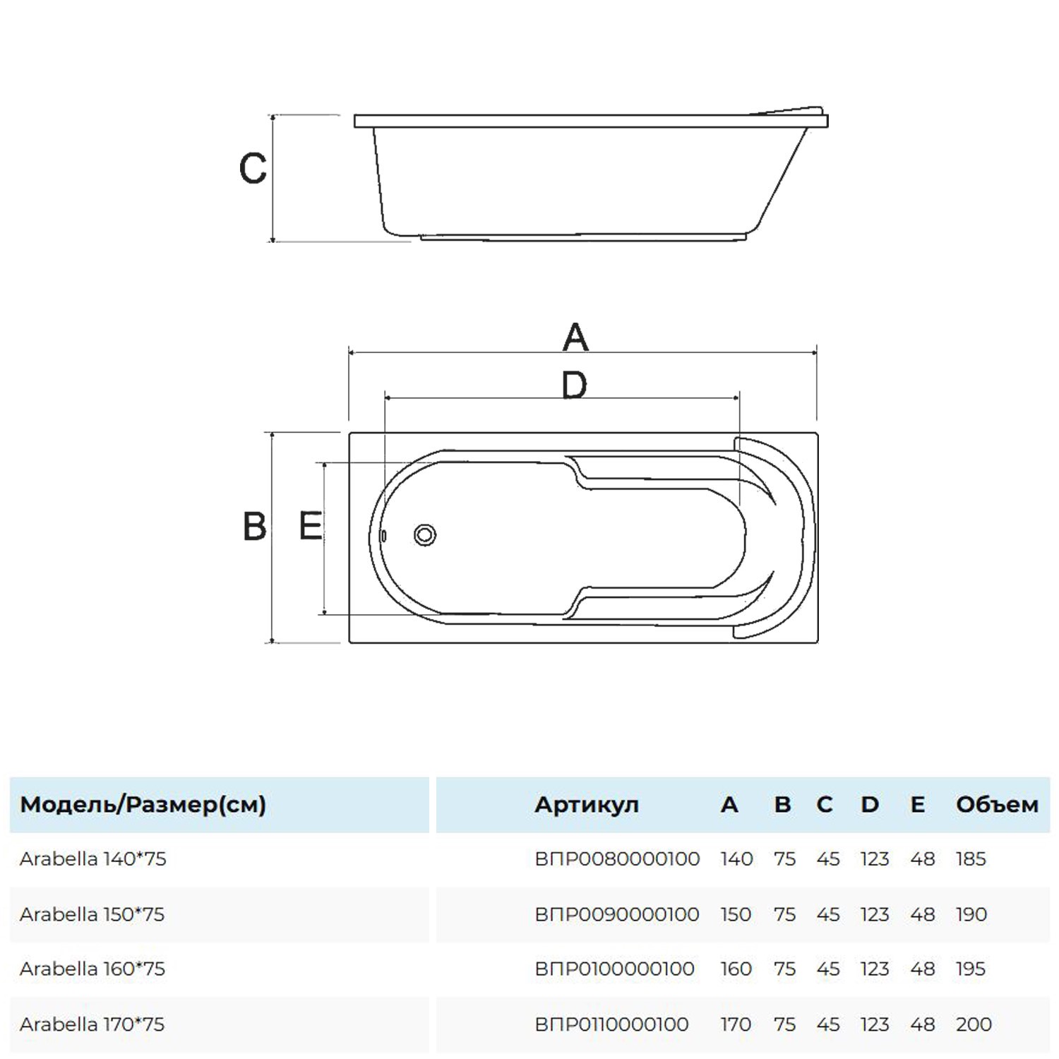 Ванна акриловая Alba Spa Arabella 170x75 см ВПР0110000100