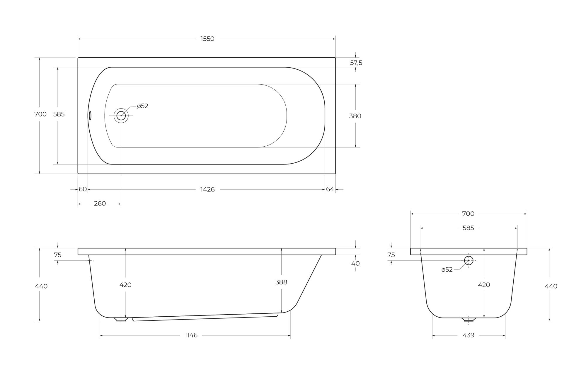 Ванна акриловая Cezares Eco 155x70 ECO-155-70-41-W37