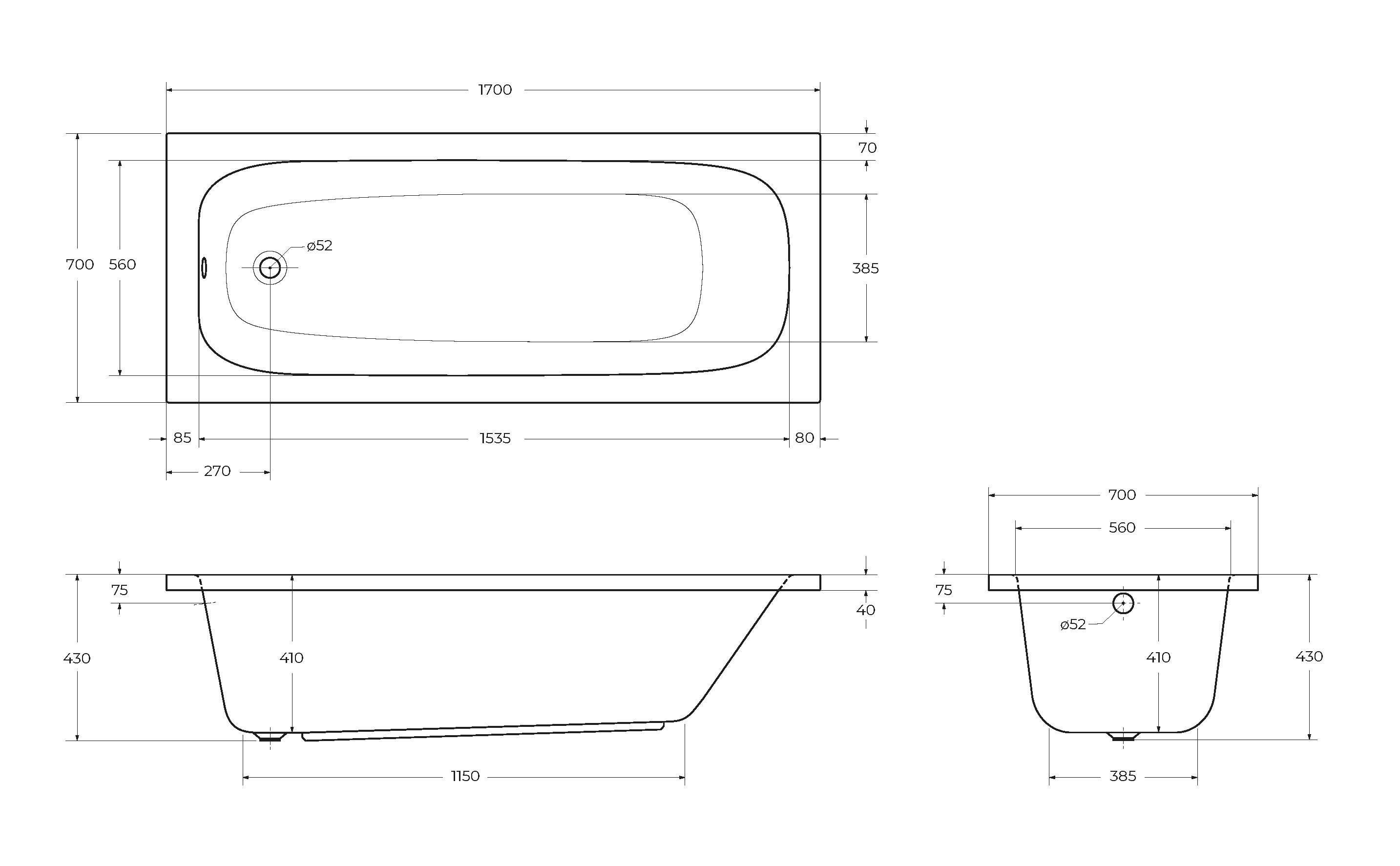 Ванна акриловая Cezares Eco 170x70 ECO-170-70-41-W37