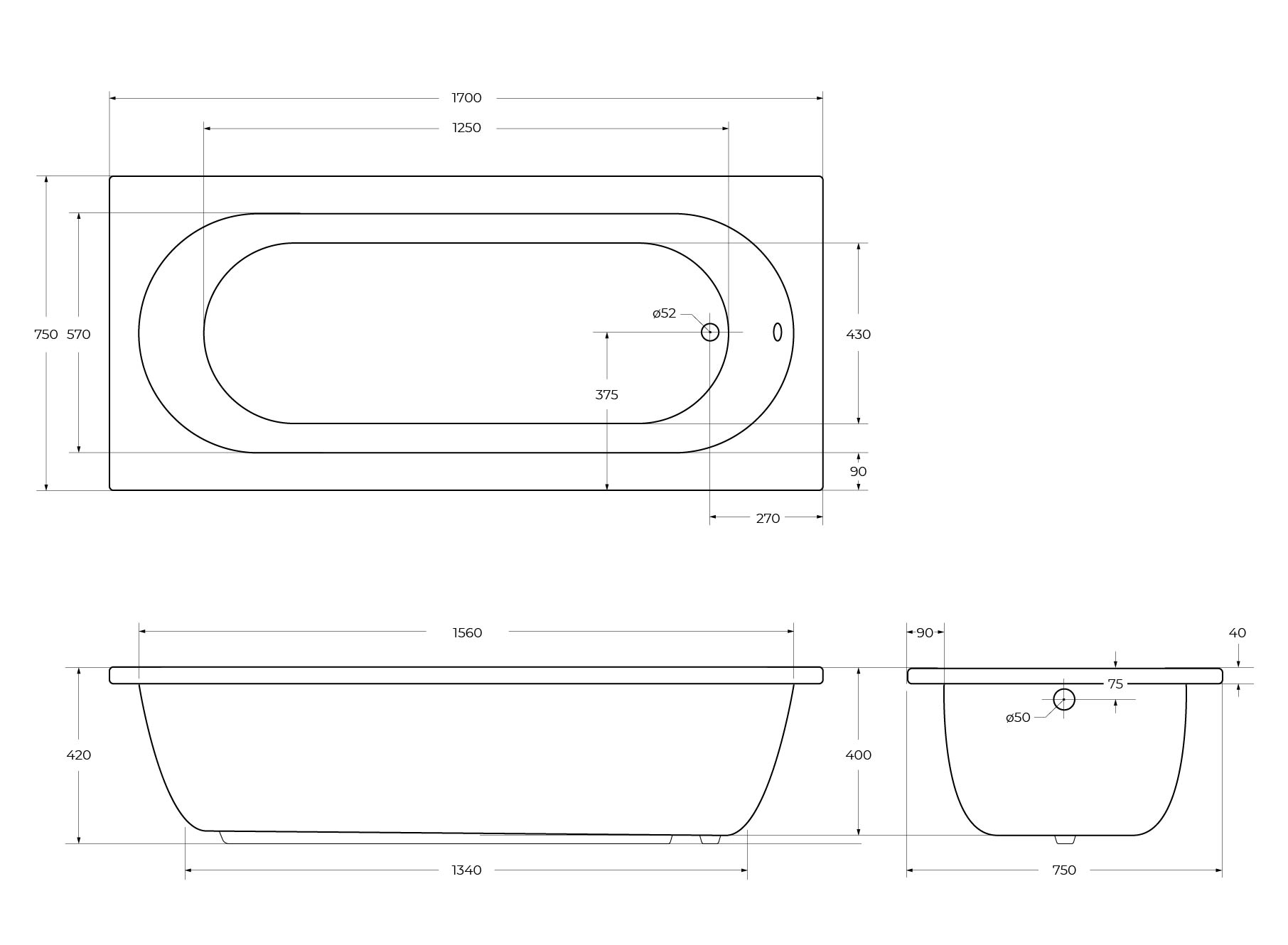 Ванна акриловая Cezares Piave 170x75 PIAVE-170-75-42-W37