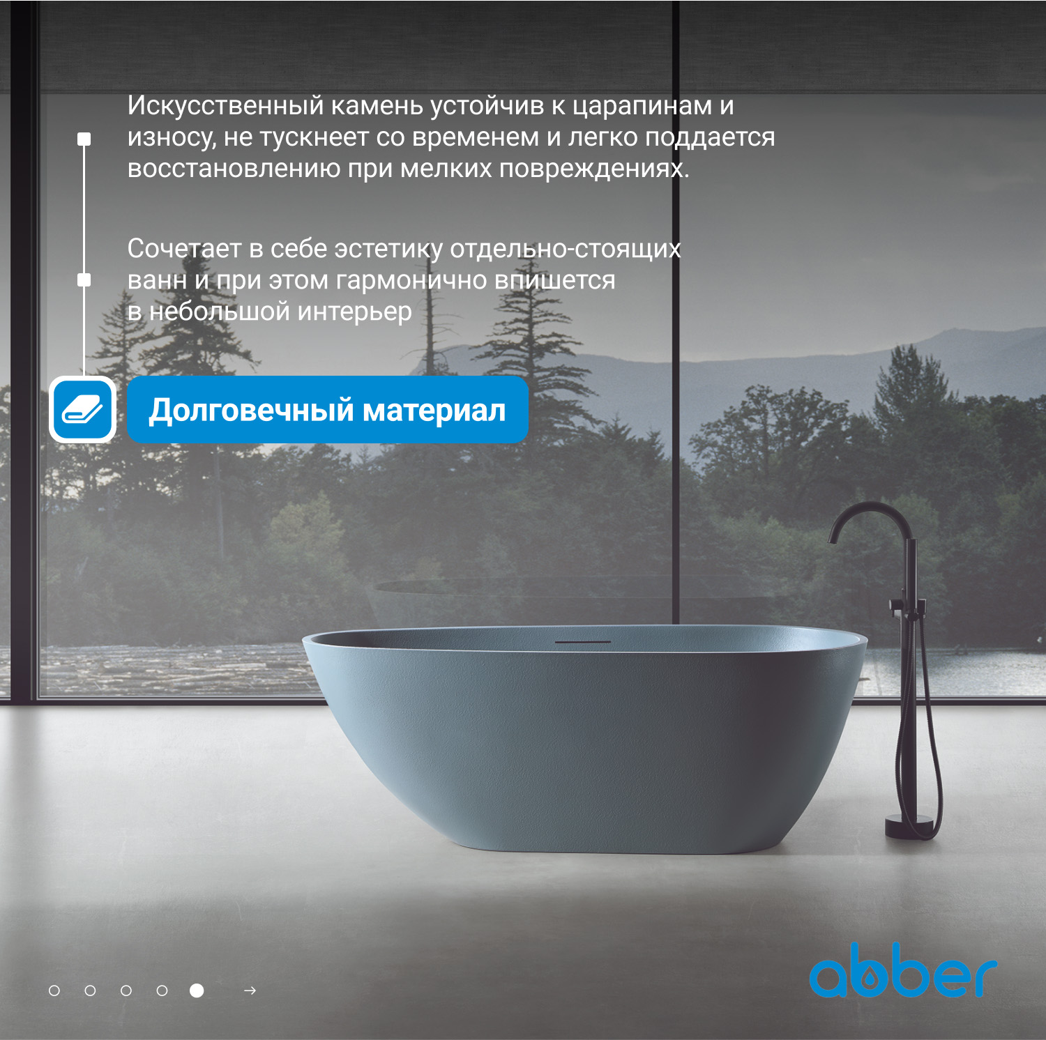 Ванны из композитного камня Rock от Abber — это скульптурная чистота линий и благородная матовая поверхность, напоминающая натуральный камень. Композитный материал дарит невероятные тактильные ощущения: он теплый, гладкий и приятно «весомый». Идеальная звукоизоляция и способность долго сохранять температуру воды превращают каждый прием ванны в настоящий ритуал релаксации.