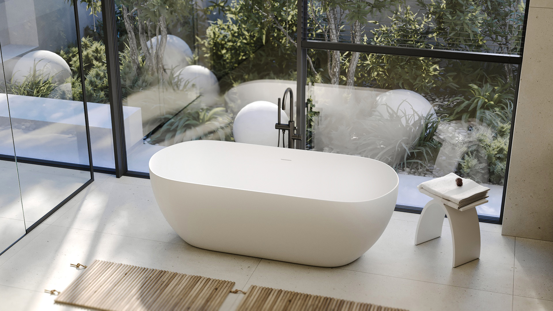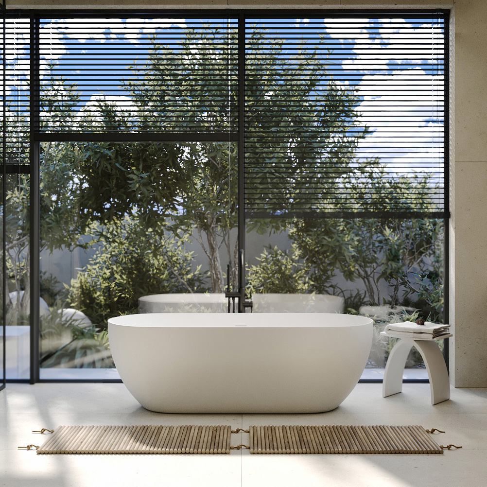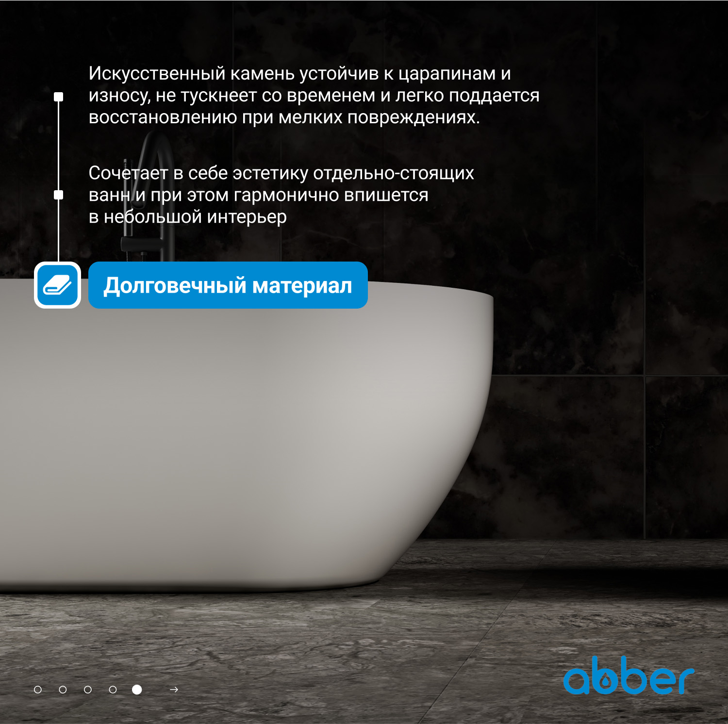 Ванны Abber из искусственного камня дарят уникальное тактильное ощущение: поверхность остается приятно теплой даже в прохладном помещении. Матовая текстура мягко рассеивает свет, создавая в ванной комнате атмосферу спа-салона. Высокая плотность материала обеспечивает отличную звукоизоляцию — наполнение чаши водой происходит почти бесшумно, сохраняя моменты уединения.