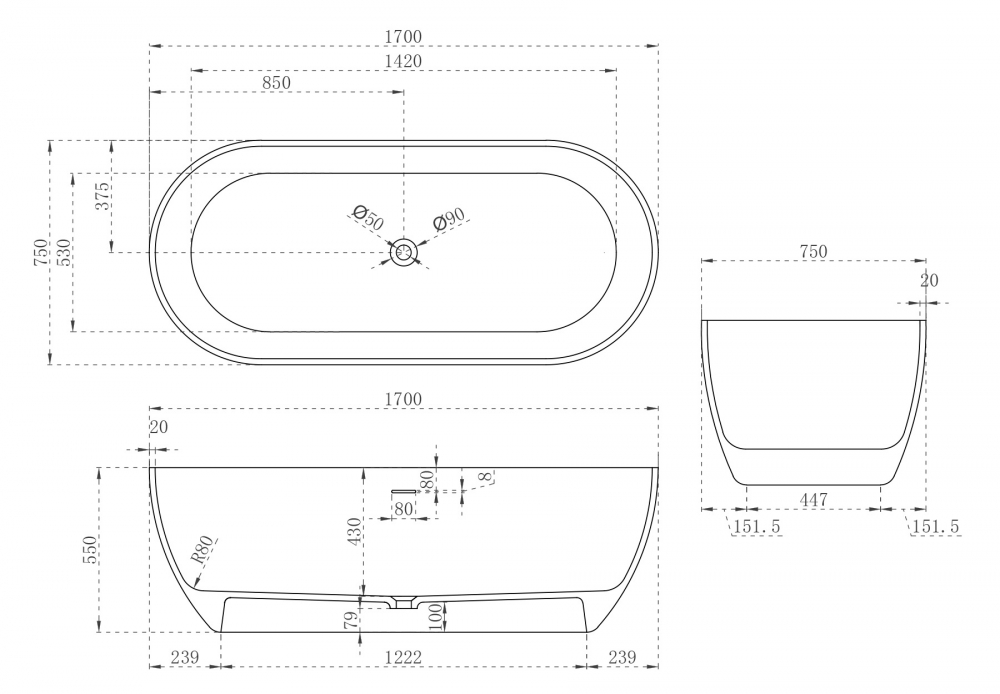 Ванна из искусственного камня ABBER Stein AS9613-1.7 белая матовая
