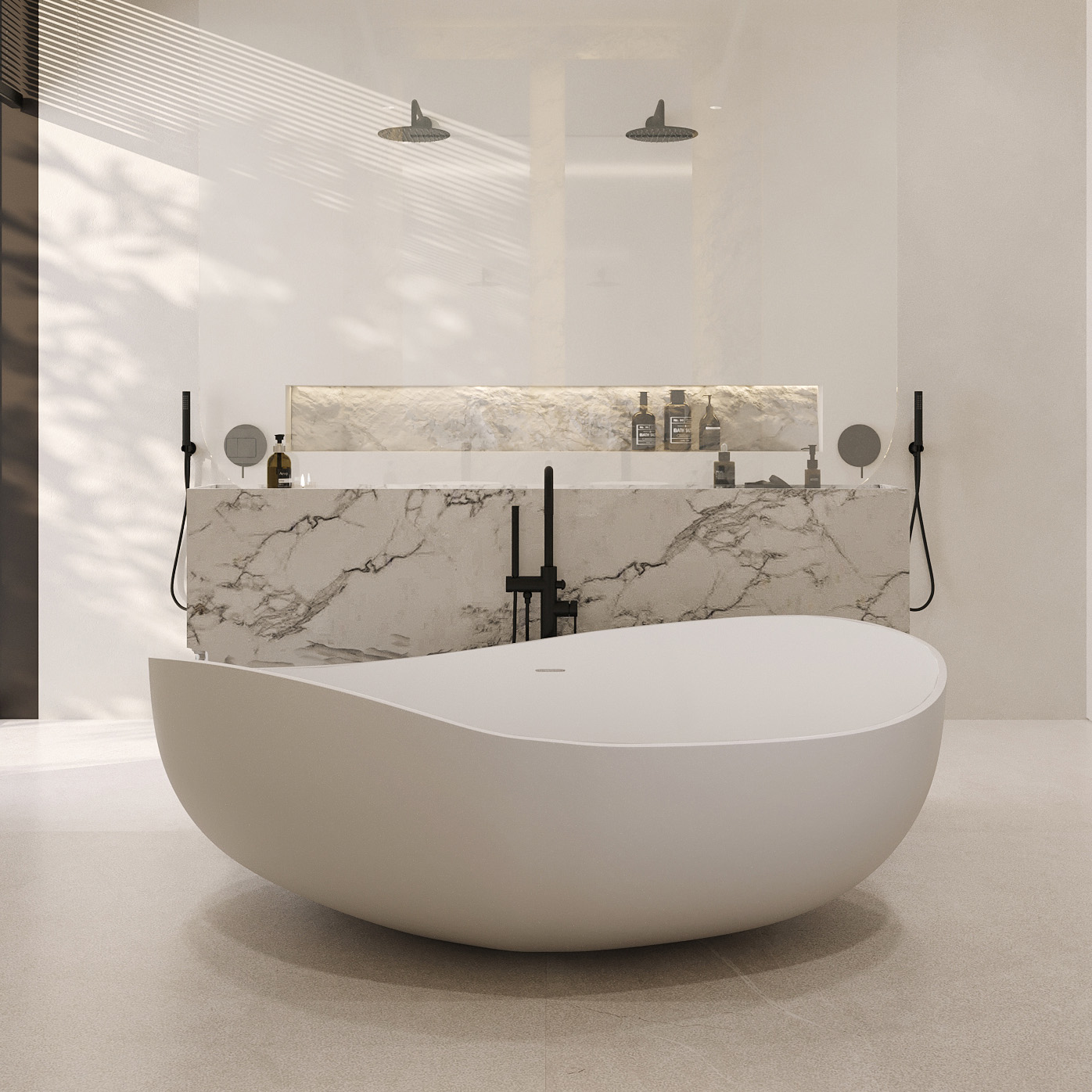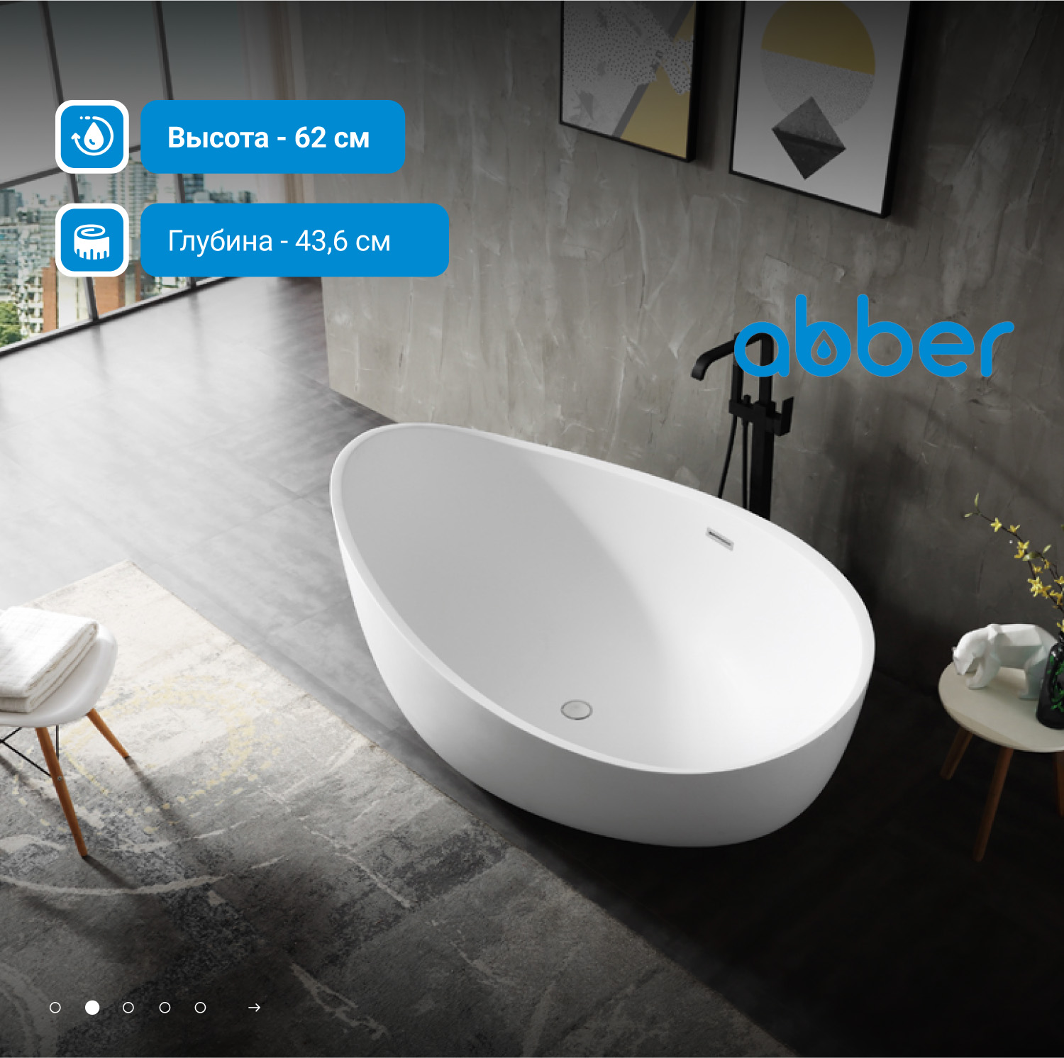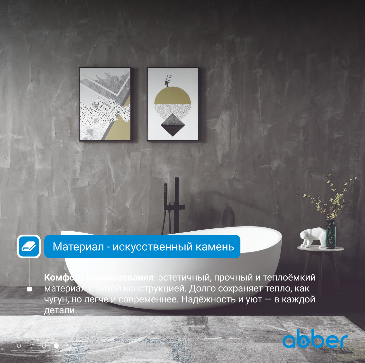 Ванны Abber из искусственного камня дарят уникальное тактильное ощущение: поверхность остается приятно теплой даже в прохладном помещении. Матовая текстура мягко рассеивает свет, создавая в ванной комнате атмосферу спа-салона. Высокая плотность материала обеспечивает отличную звукоизоляцию — наполнение чаши водой происходит почти бесшумно, сохраняя моменты уединения.