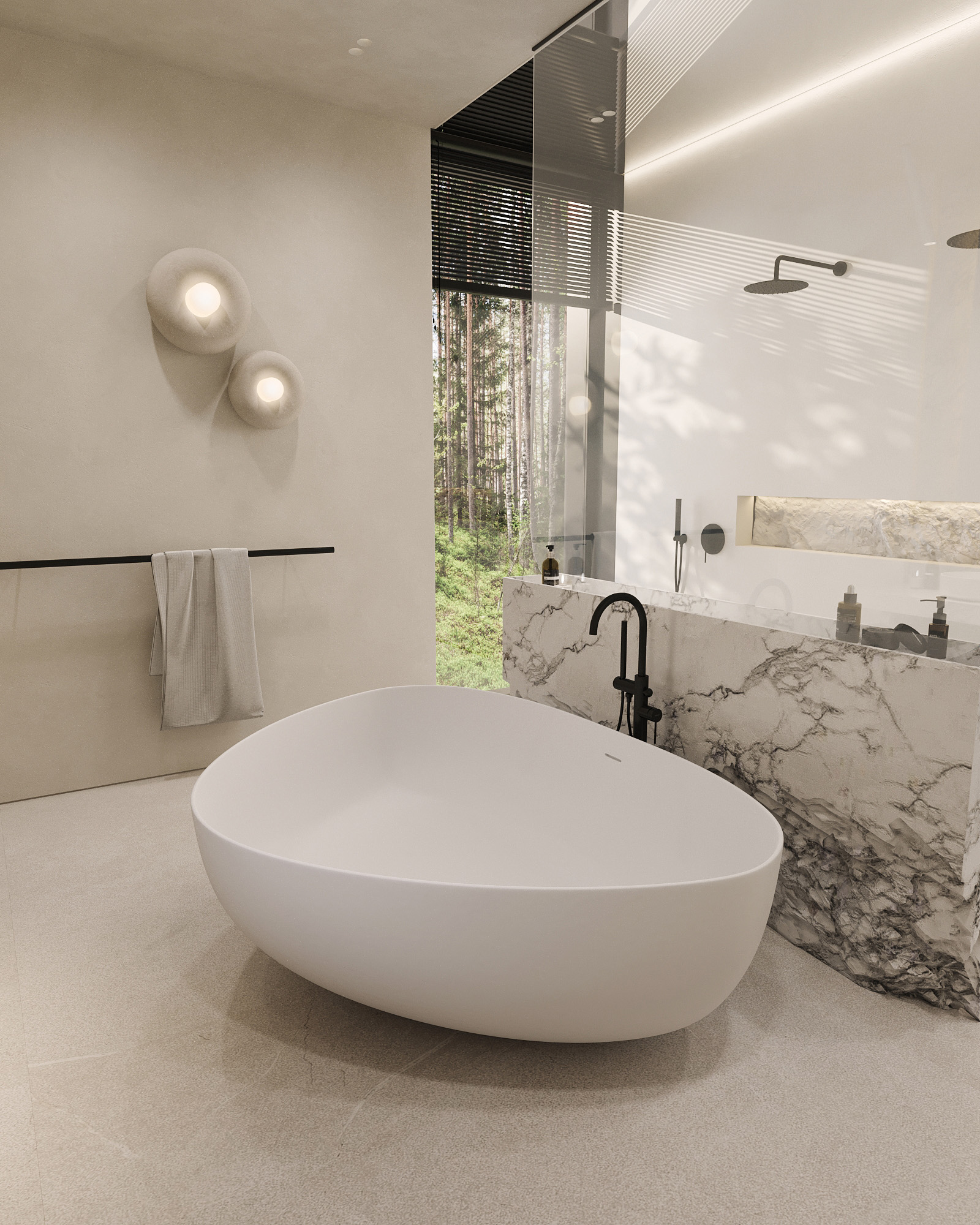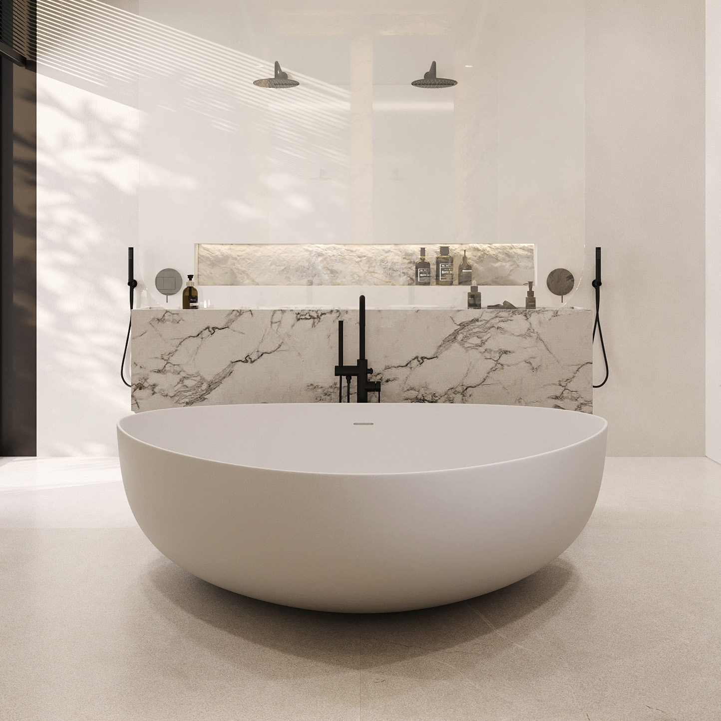 Ванны Abber из искусственного камня дарят уникальное тактильное ощущение: поверхность остается приятно теплой даже в прохладном помещении. Матовая текстура мягко рассеивает свет, создавая в ванной комнате атмосферу спа-салона. Высокая плотность материала обеспечивает отличную звукоизоляцию — наполнение чаши водой происходит почти бесшумно, сохраняя моменты уединения.