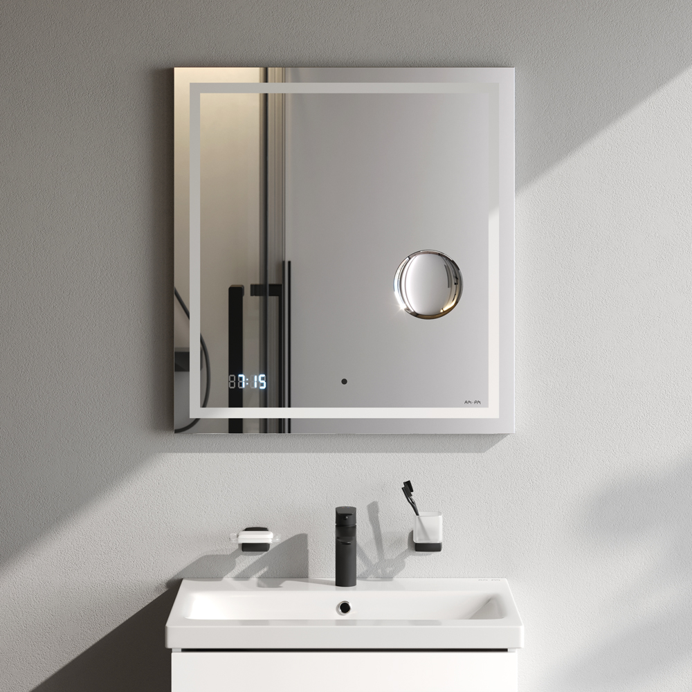 Ультрамодный лаконичный дизайн зеркал Gem от собственной студии дизайна AM.PM Design подойдет к интерьеру любой ванной комнаты. Премиальный функционал в коллекции доступного ценового сегмента: встроенное косметическое зеркало увеличивающее изображение и часы прямо под стеклом - всегда на виду.