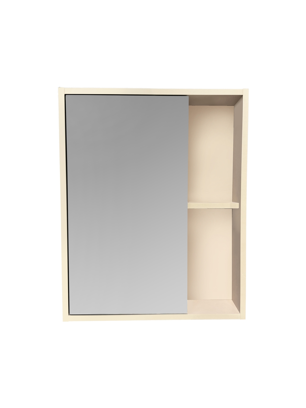 Зеркальный шкаф без подсветки с одной распашной дверкой и открытыми полками (слева или справа, зависит от установки). Внутри шкафа одна внутрення полка. Универсальный.